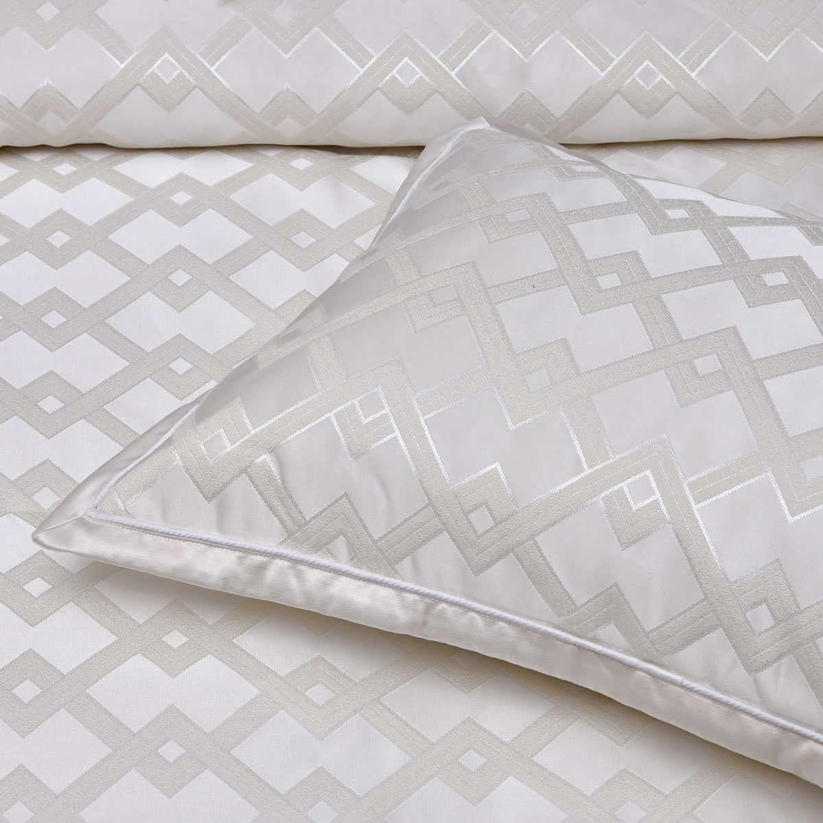 The soft pearl tone brings a calm, neutral charm to your decor. Its eye-catching geometric jacquard design adds just the right amount of texture and detail. With its stylish pattern and coordinated pieces, it gives your bed a complete, polished look, perfect for both modern and classic styles.