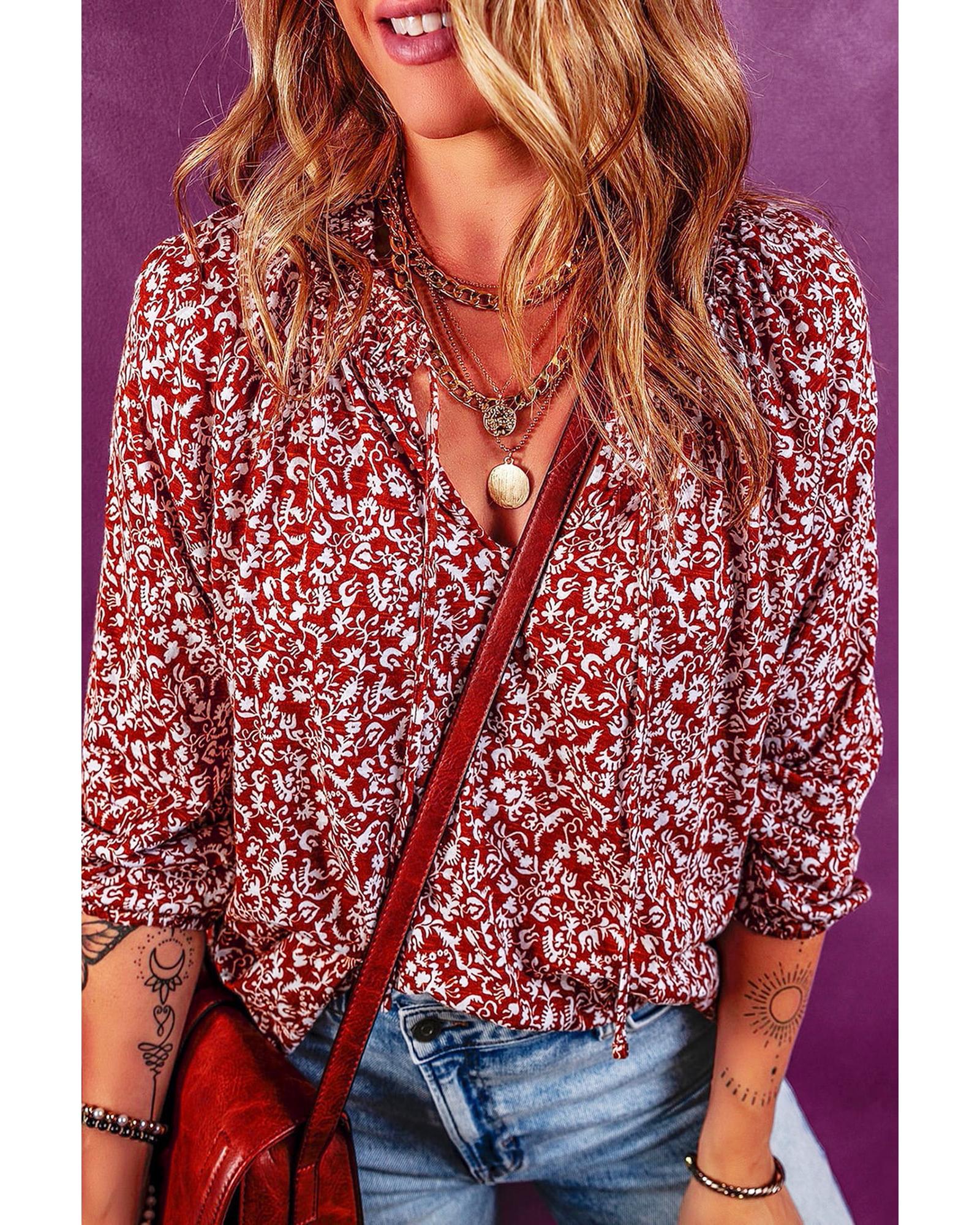 Charming floral blouse in Biking Red Notched V - neck and bracelet sleeves Shift fit for a comfortable wear Smocked details and tied neck for added chicness Versatile piece that can be paired with pants jeans or shorts Available in various sizes for both men and women