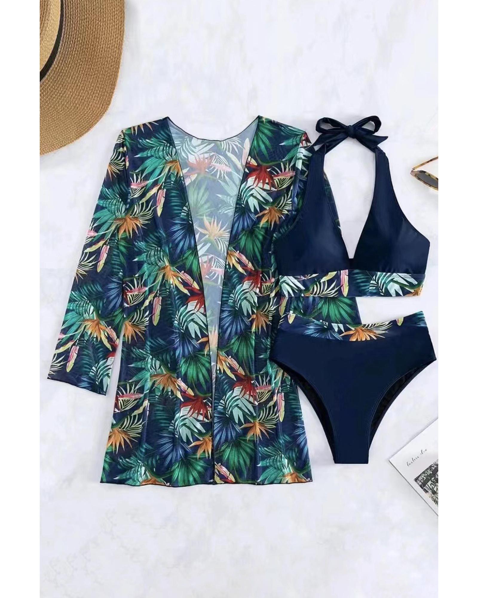 Black 3pcs Tropical Contrast Trim Halter Bikini Set with Cover up - S Original price was: $66.99.Current price is: $35.99.