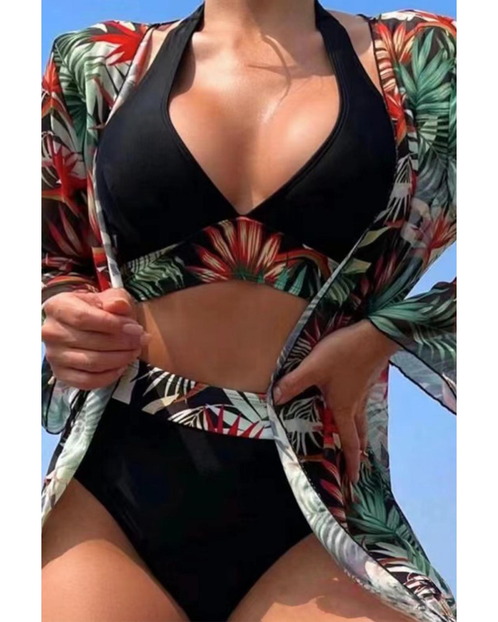 Black 3pcs Tropical Contrast Trim Halter Bikini Set with Cover up - S