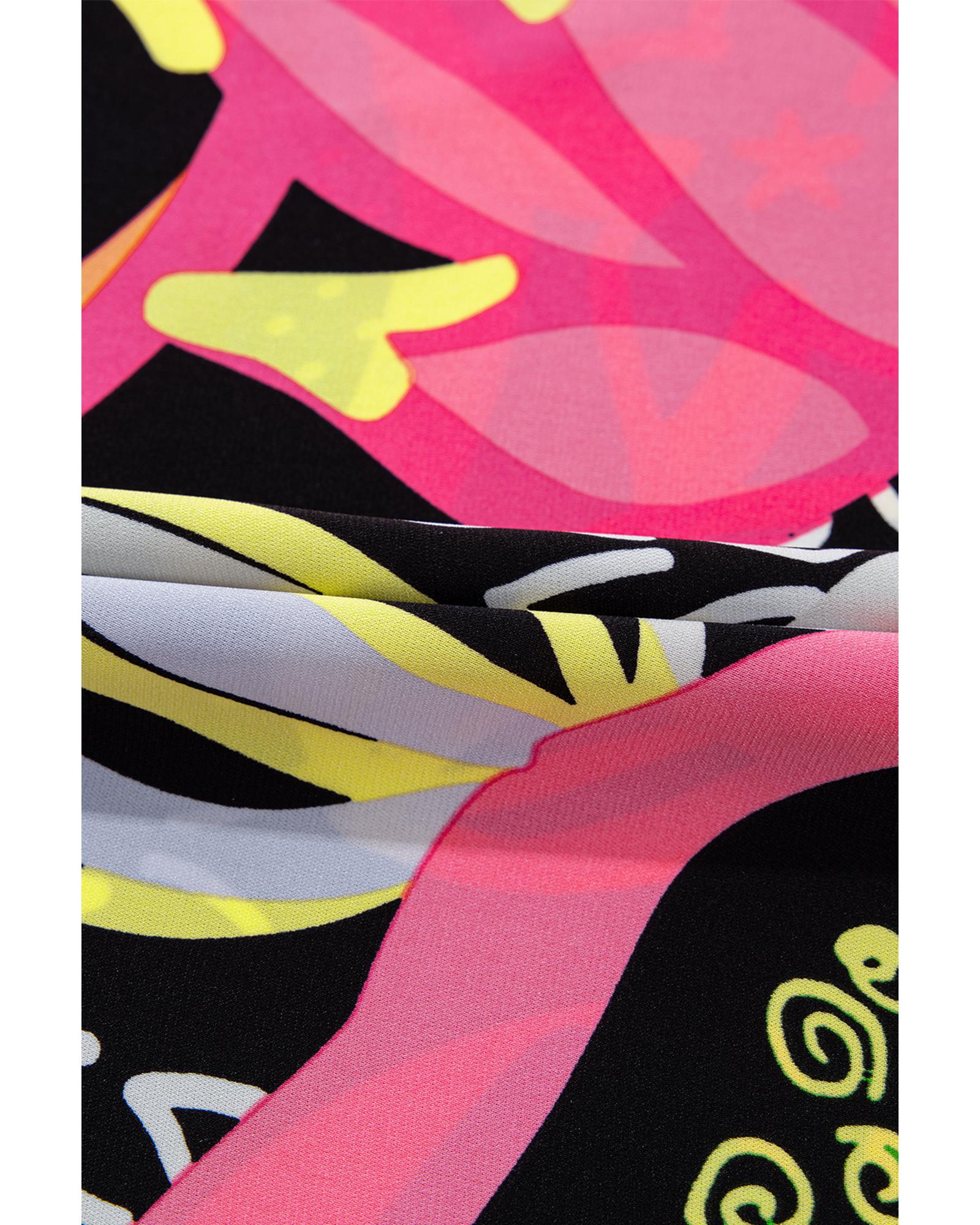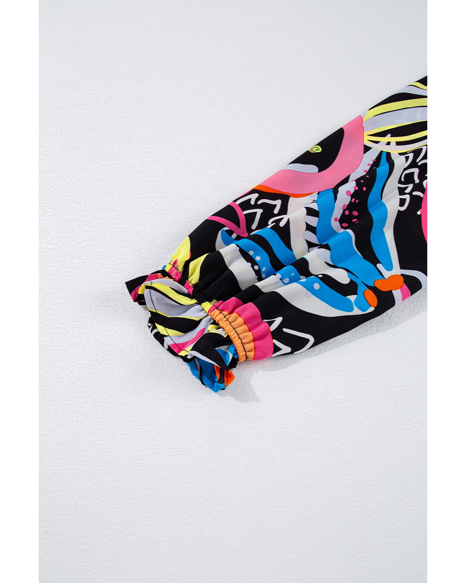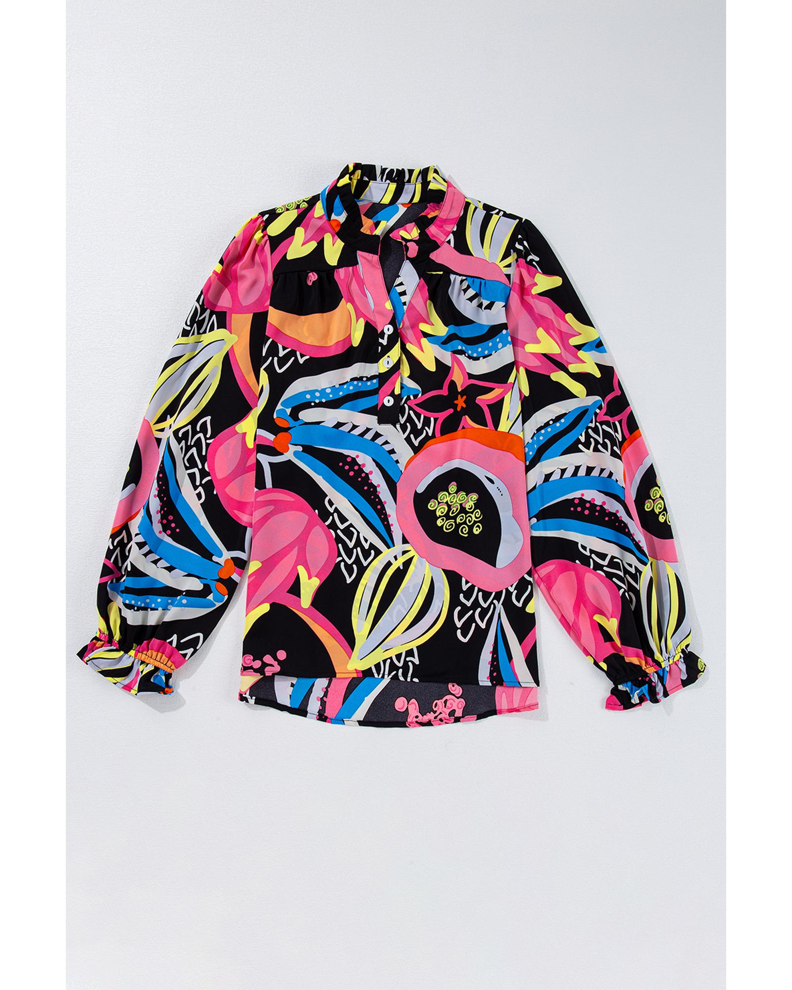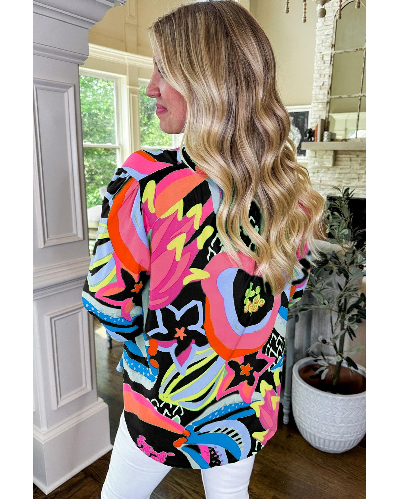 Black Abstract Print Ruffled Sleeve Buttoned V Neck Blouse – M