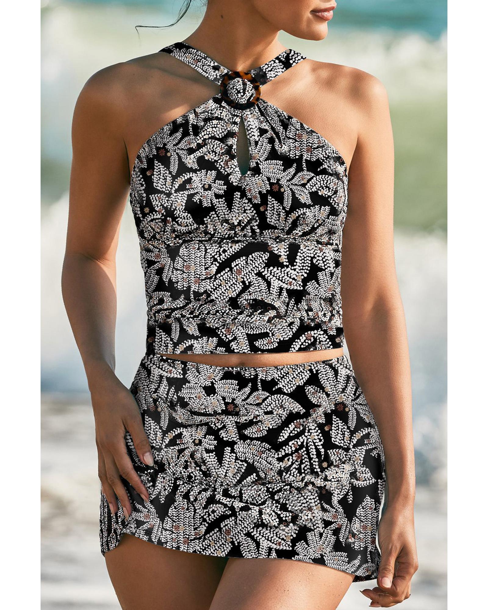 Black Abstract Printed Buckle Crossed Straps Skirted Tankini 2pcs Swimsuit – 2XL