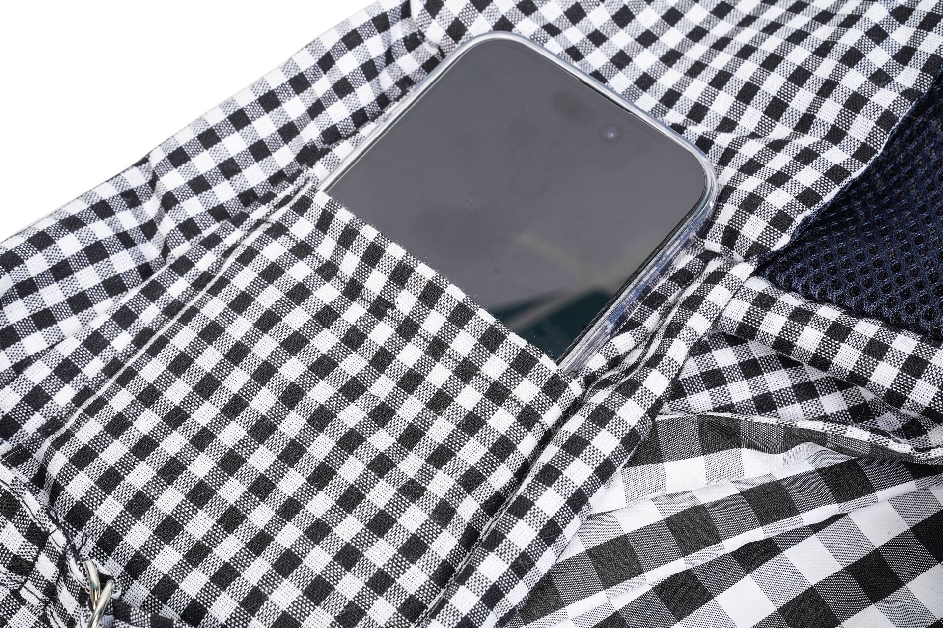 • Soft & Breathable Materials: The outer layer is crafted from comfortable pure cotton fabric in a classic checkered pattern, while the inner lining is a smooth polyester. The shoulder strap features a breathable mesh panel to reduce stuffiness and enhance comfort for the wearer.