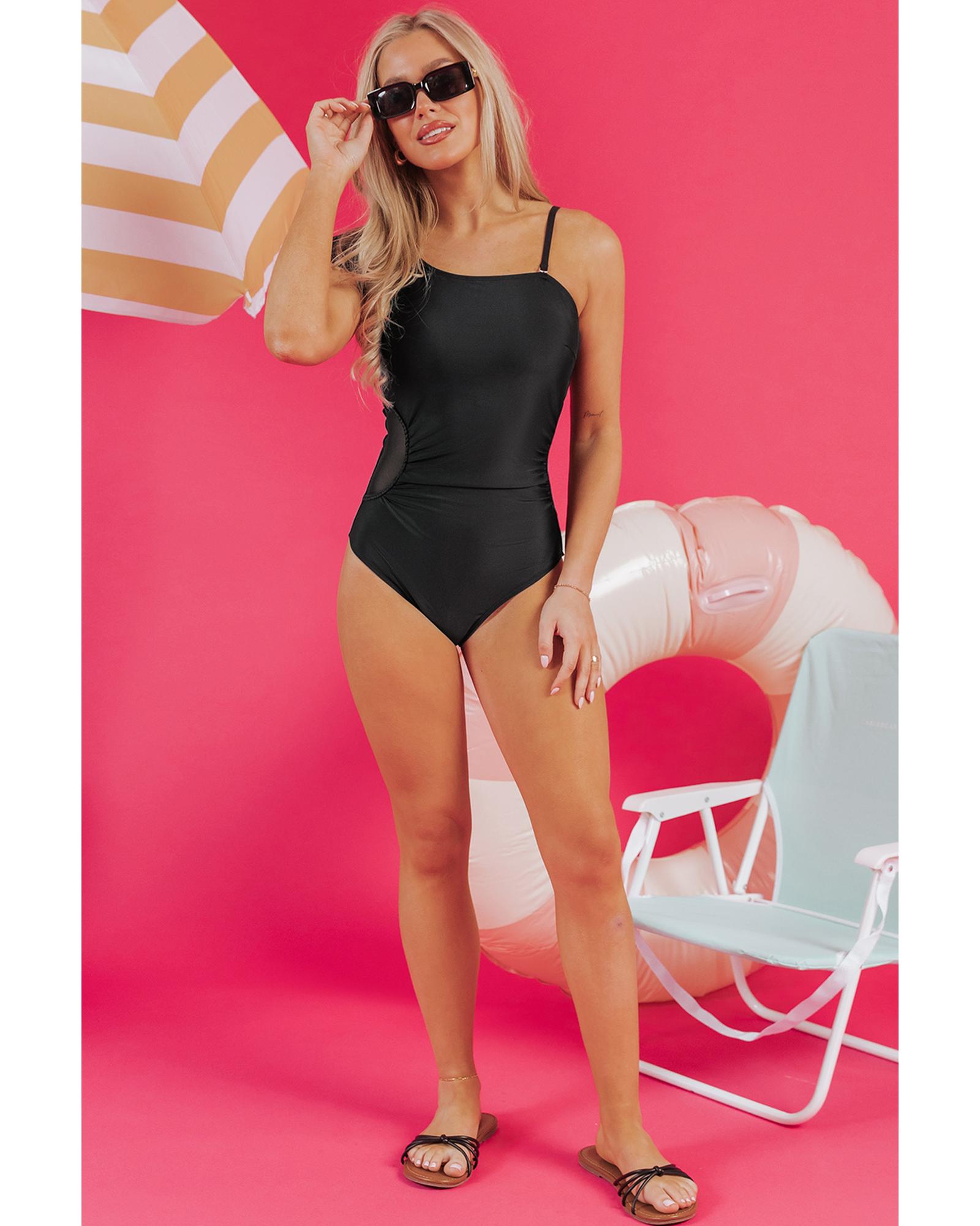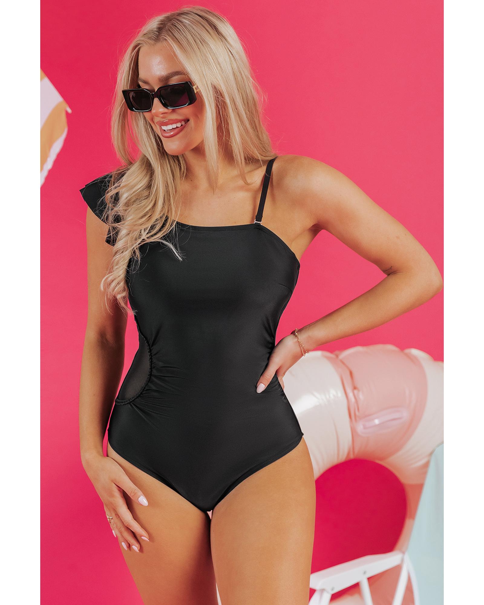 Black Asymmetric Ruffle Shoulder Pleated One Piece Swimsuit – L