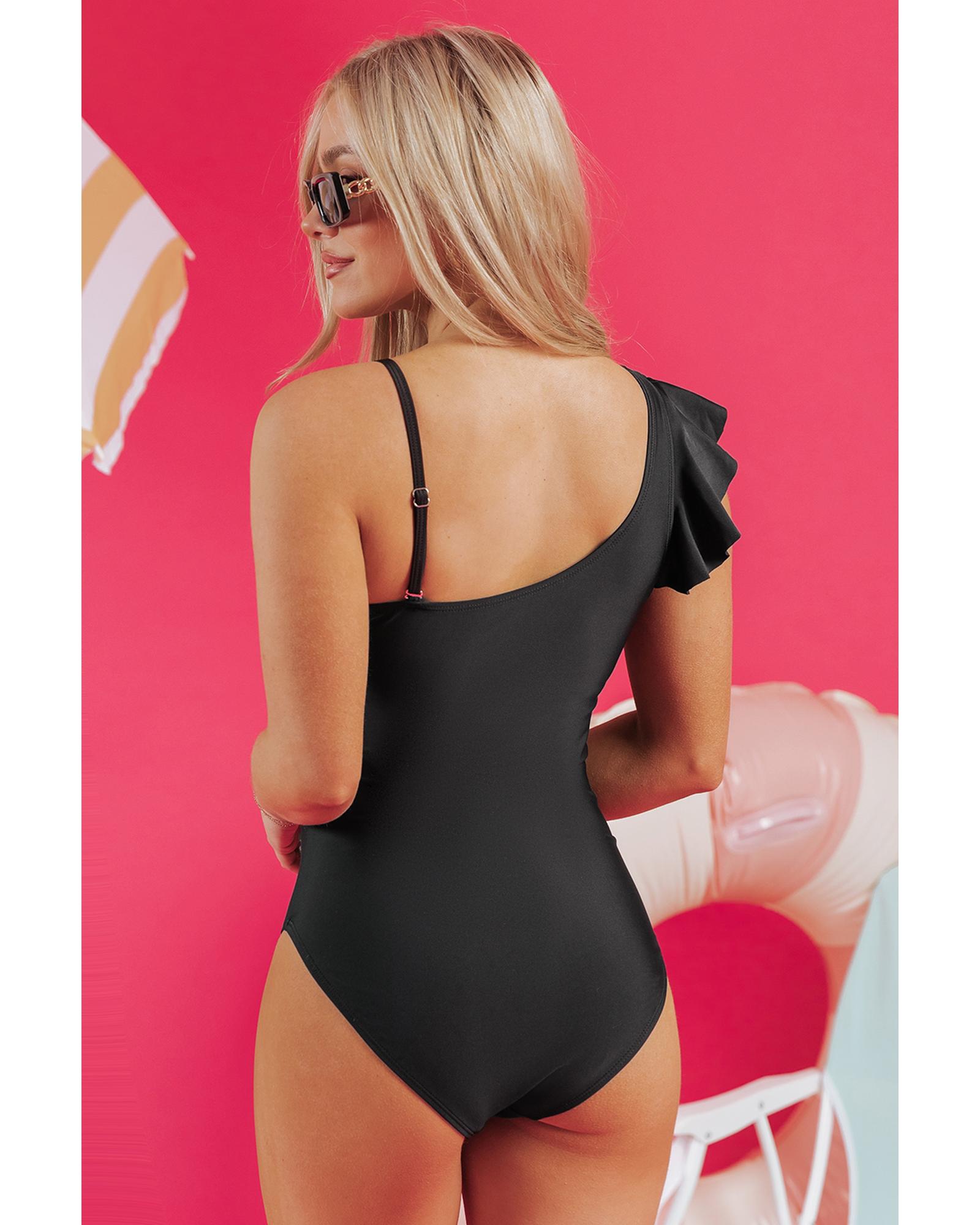 Black Asymmetric Ruffle Shoulder Pleated One Piece Swimsuit – M