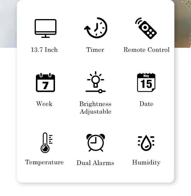 - Functions: Time, Date, Day, Temperature (C/F), Humidity, Dual Alarms, Snooze, 5-Level Brightness Adjustment, Remote Control