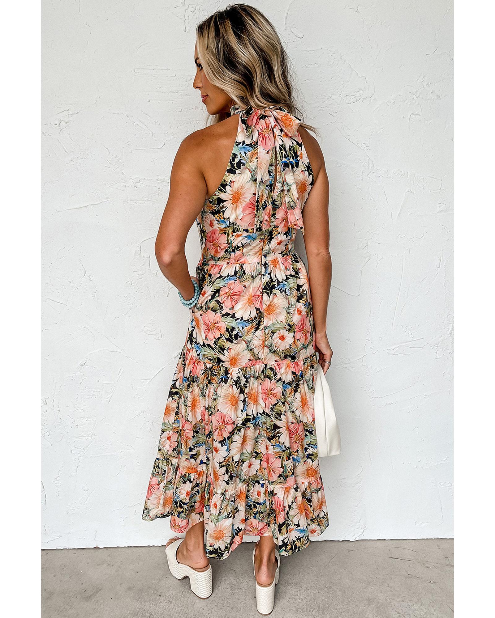 Black Boho Floral Print Knotted Halter Ruffled Maxi Dress – XL