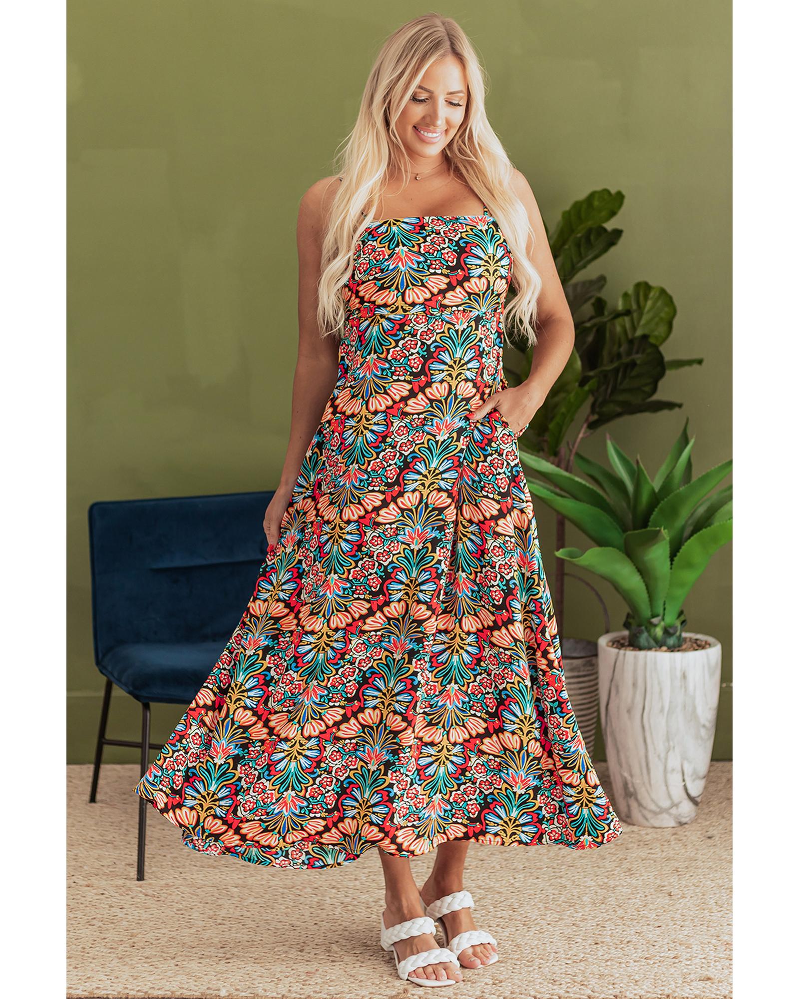 Black Boho Floral Print Thin Straps Sleeveless High Waist Maxi Dress – M