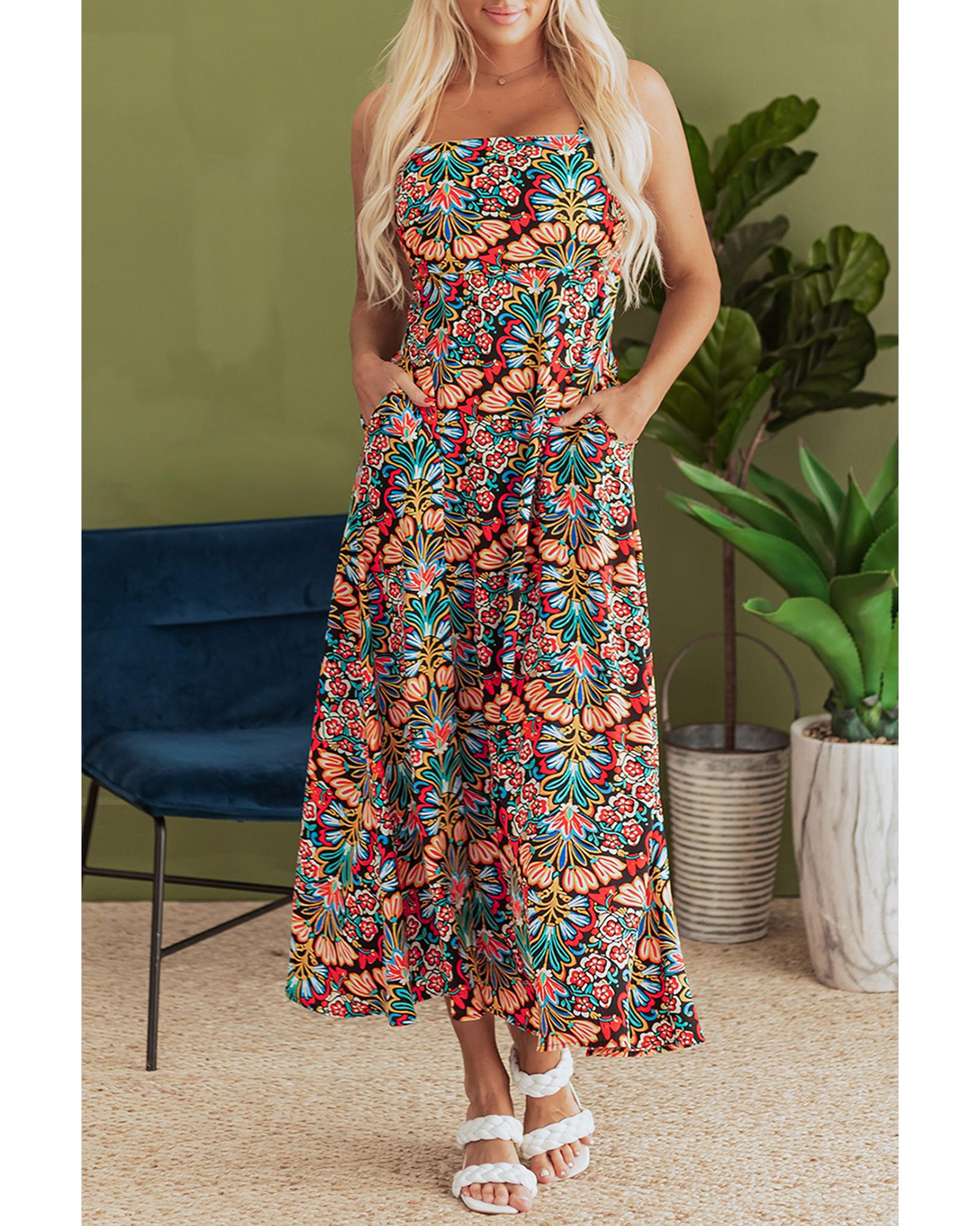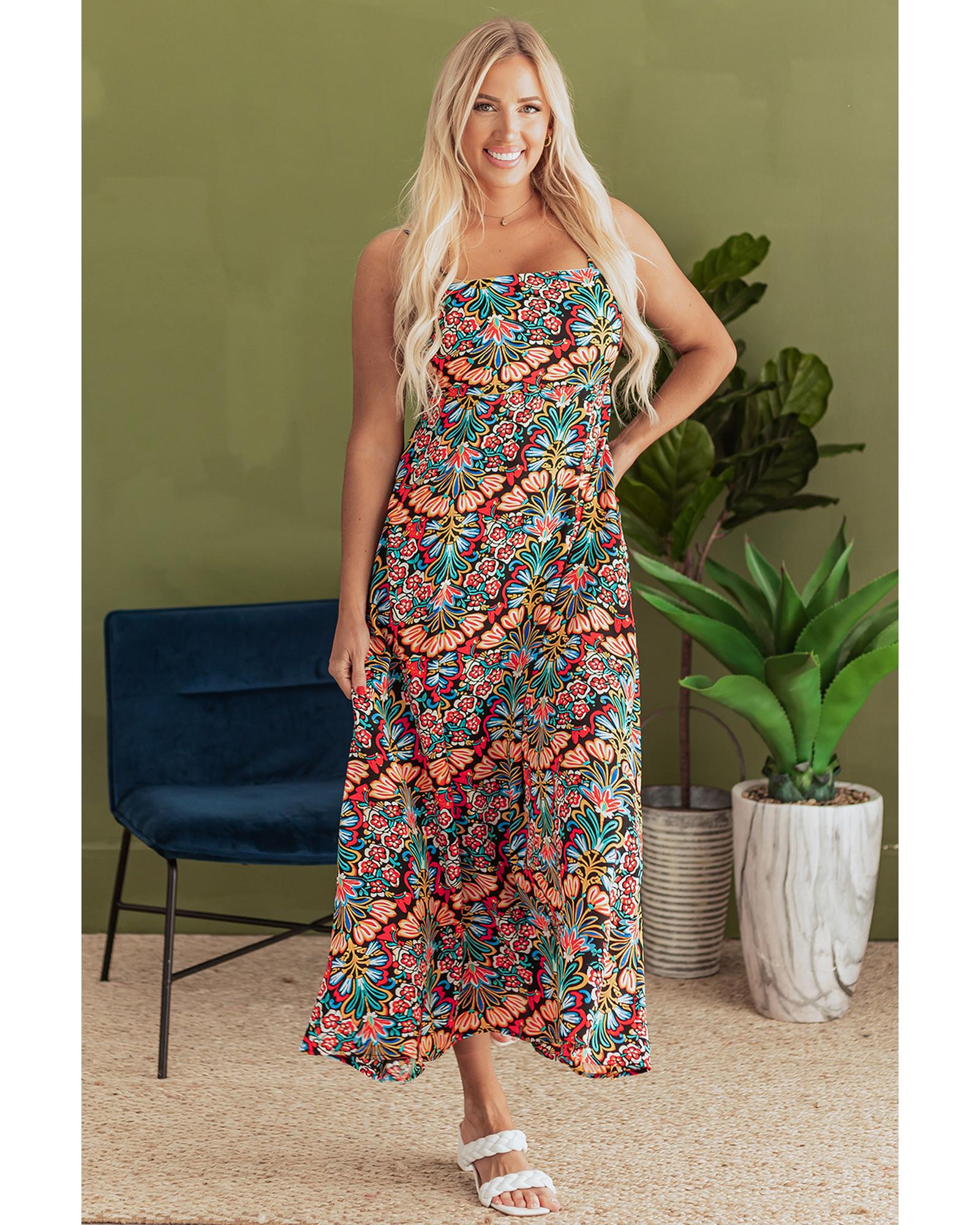Black Boho Floral Print Thin Straps Sleeveless High Waist Maxi Dress – XL