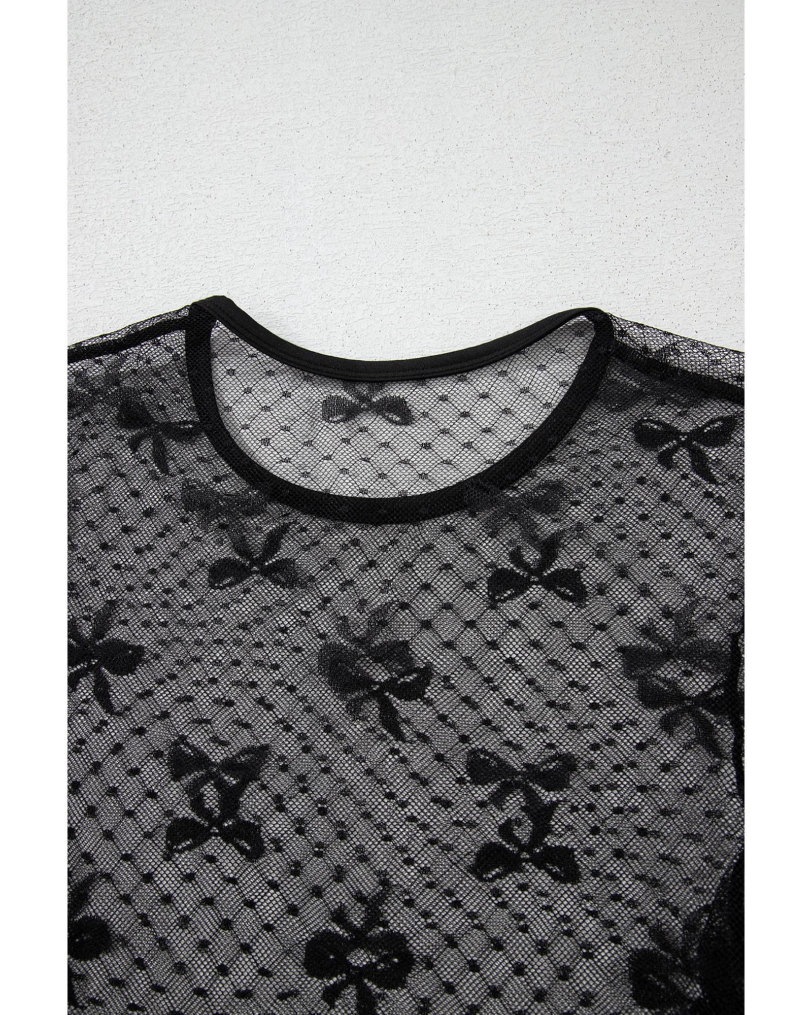 Black Bow Pattern Accent Mesh Long Sleeve Top – S