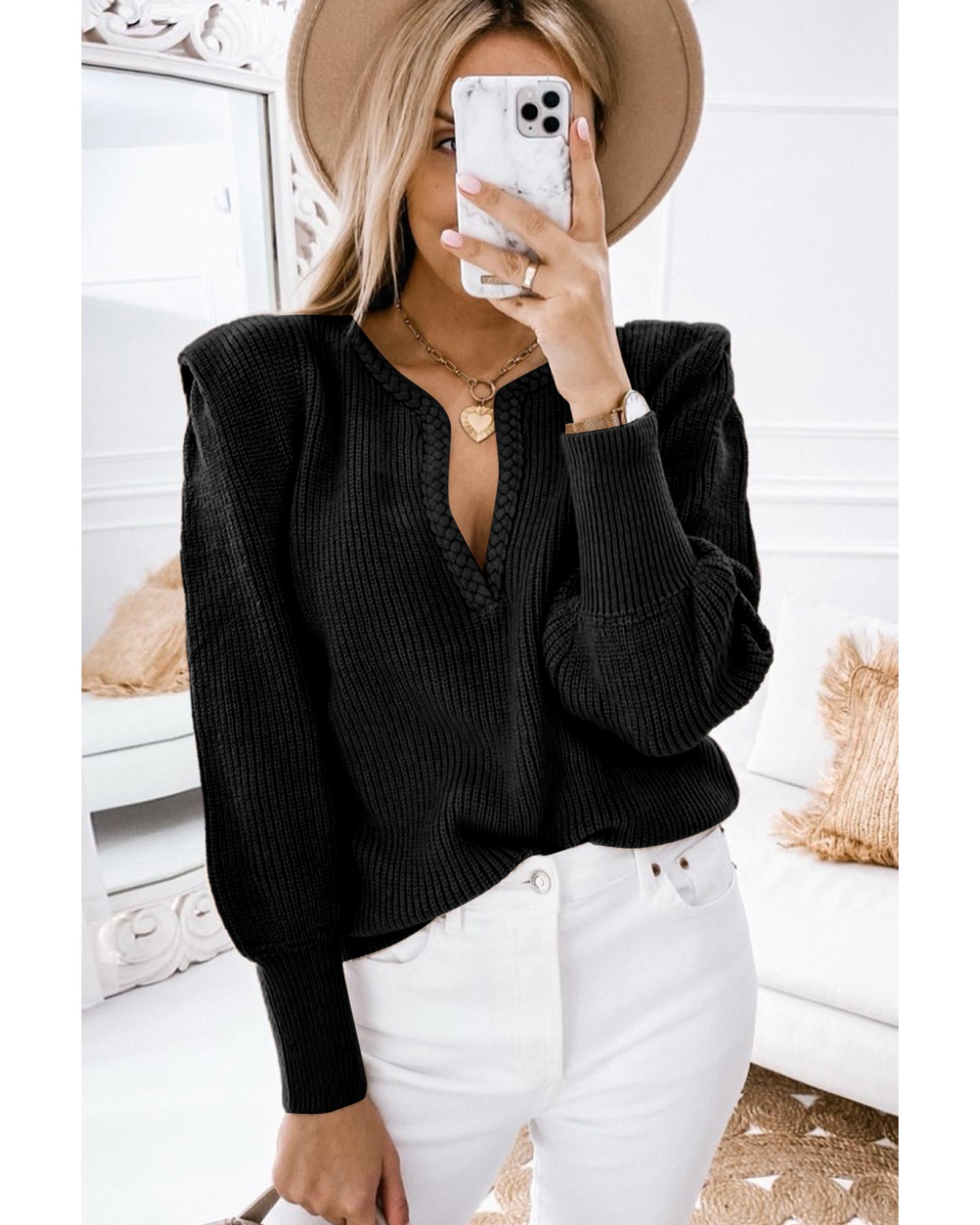 Black Braided Notched V Neckline Puff Sleeve Knitted Sweater – XL