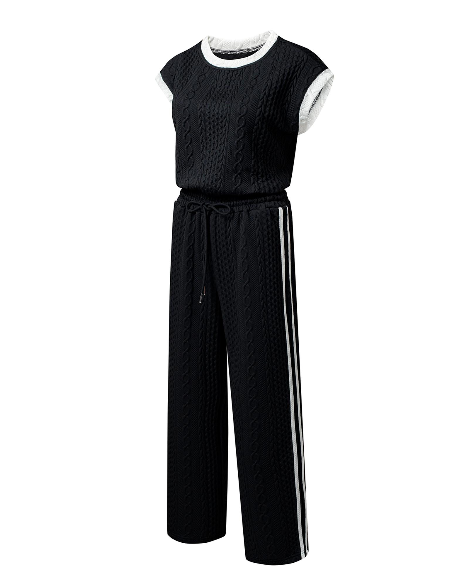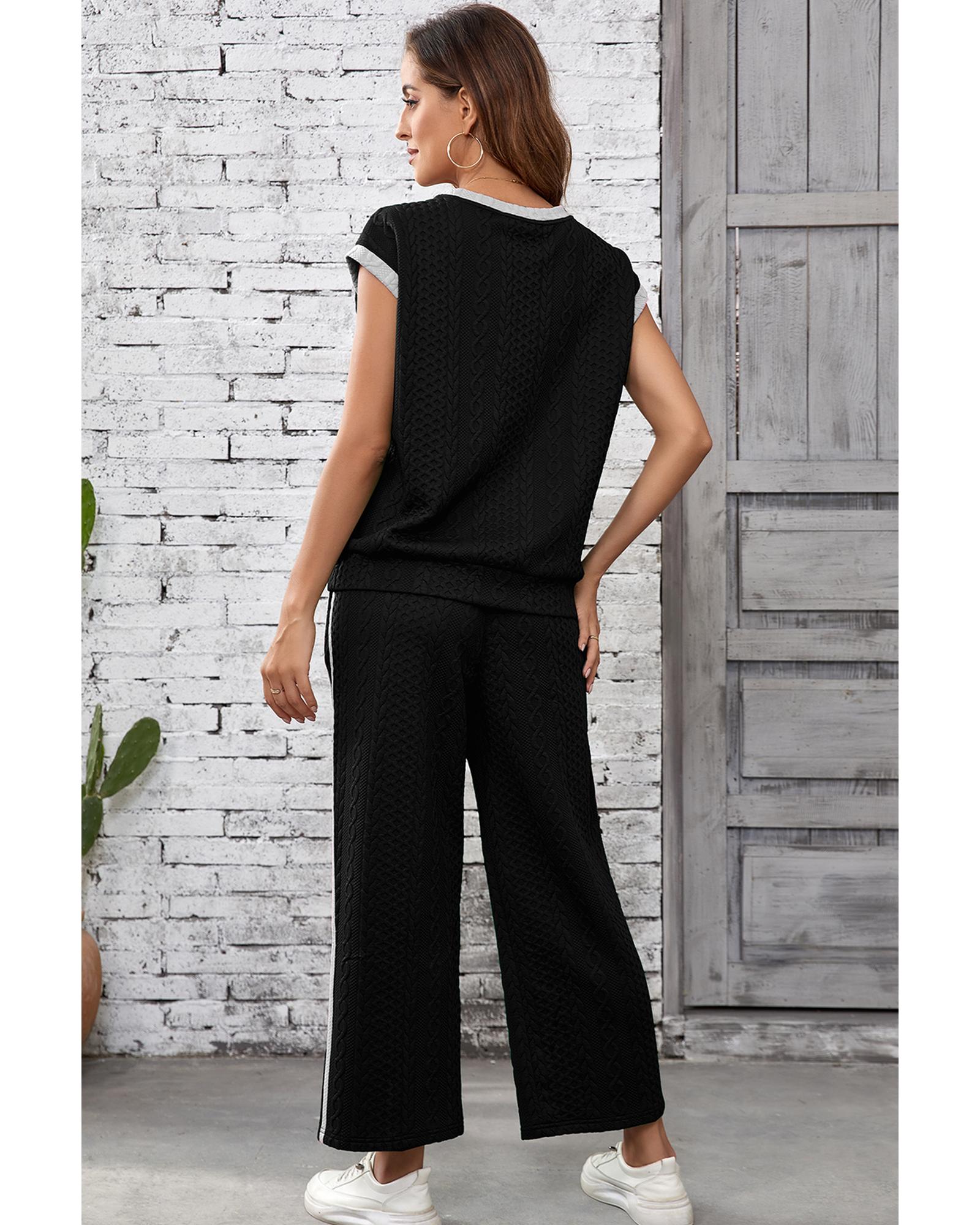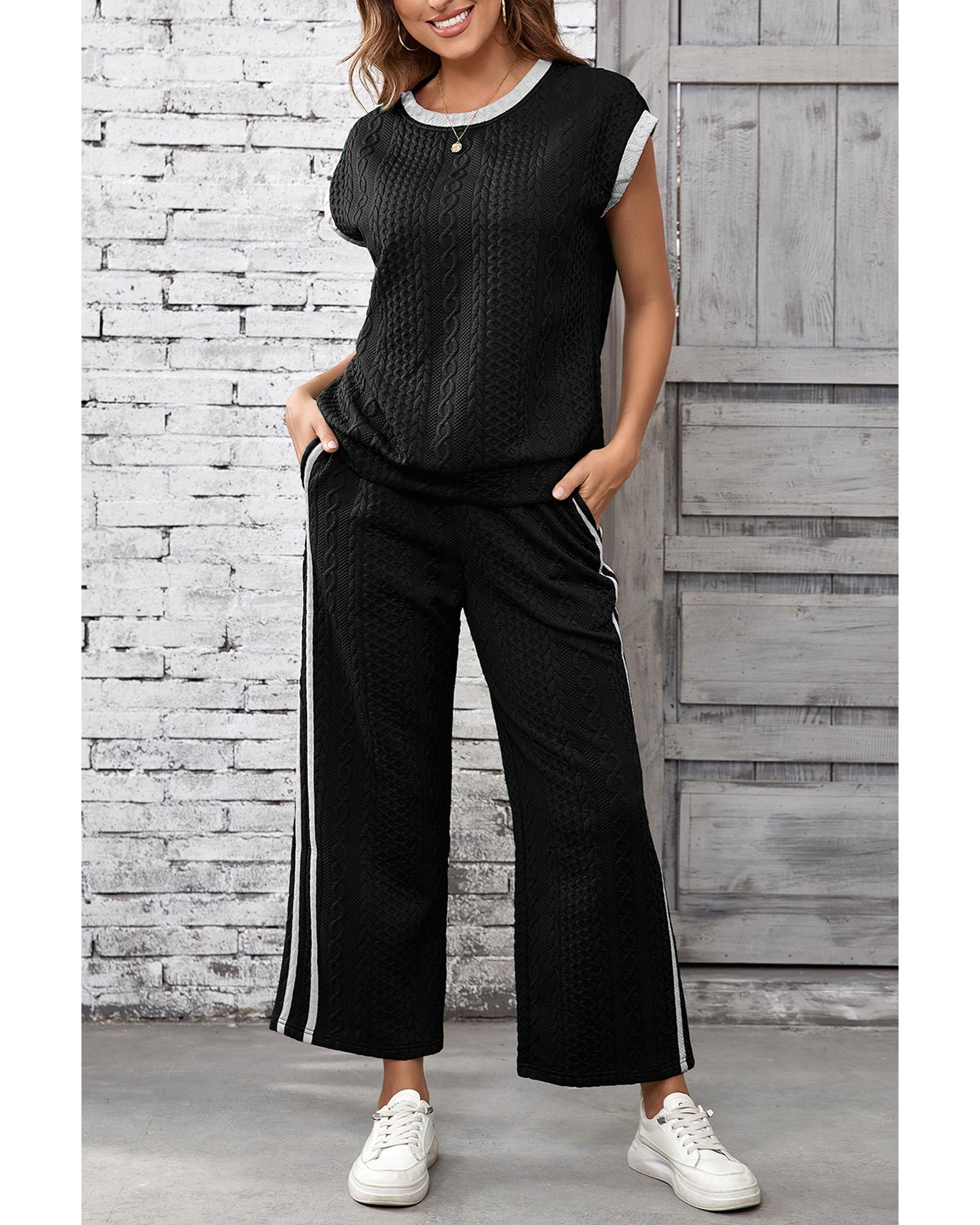 Black Cable Knit Contrast Trim Short Sleeve Top and Pants Set – M