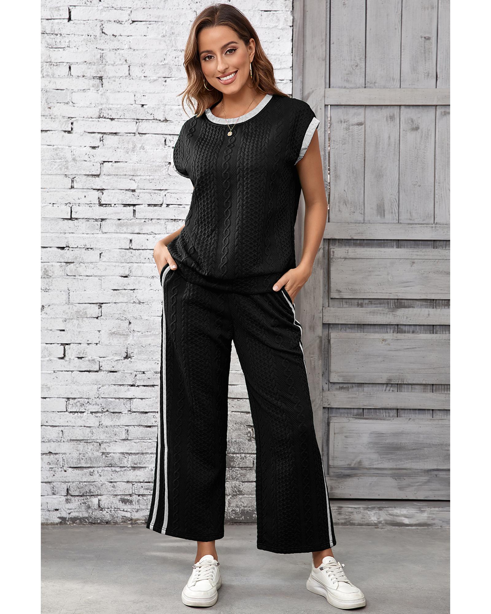 Black Cable Knit Contrast Trim Short Sleeve Top and Pants Set – S