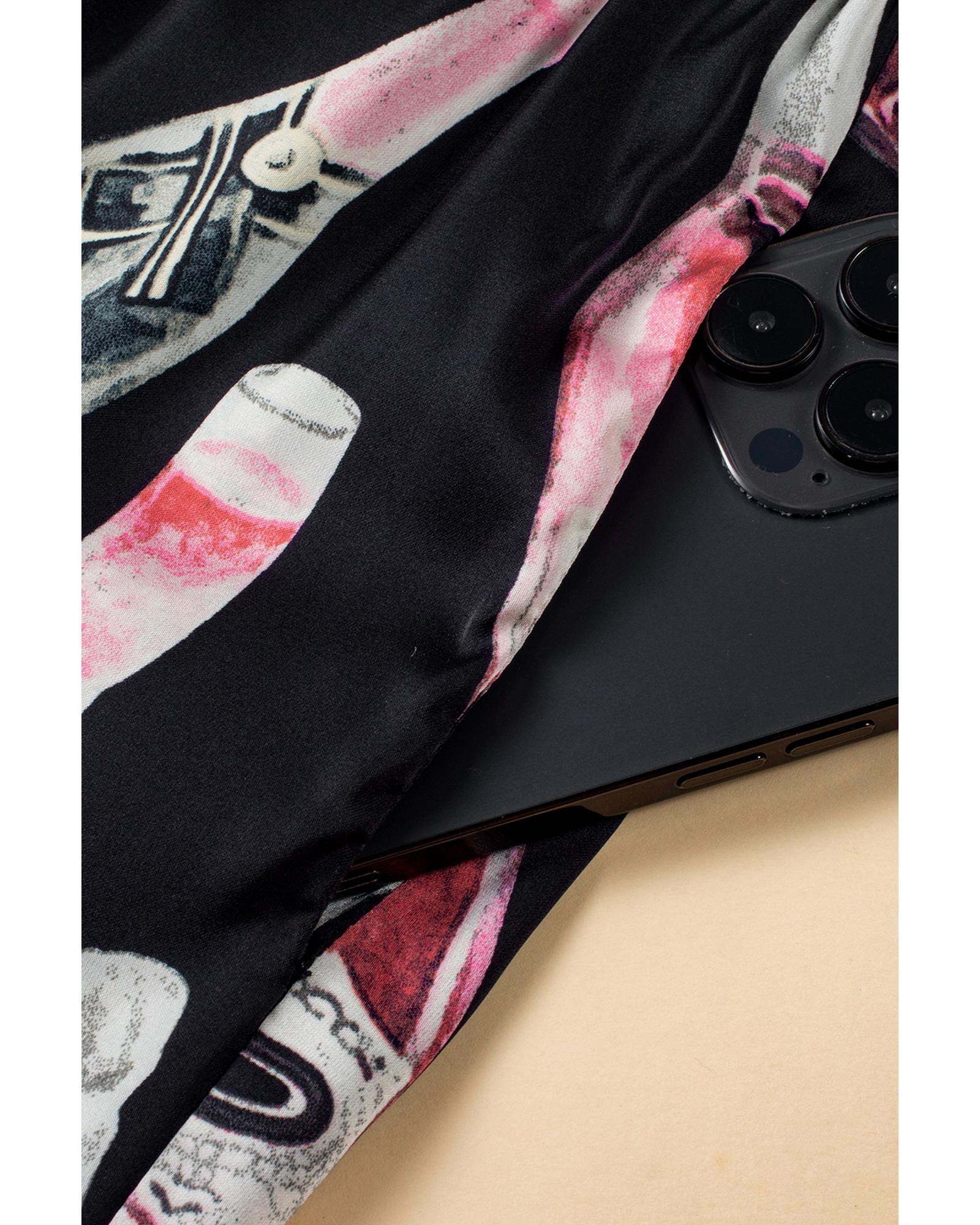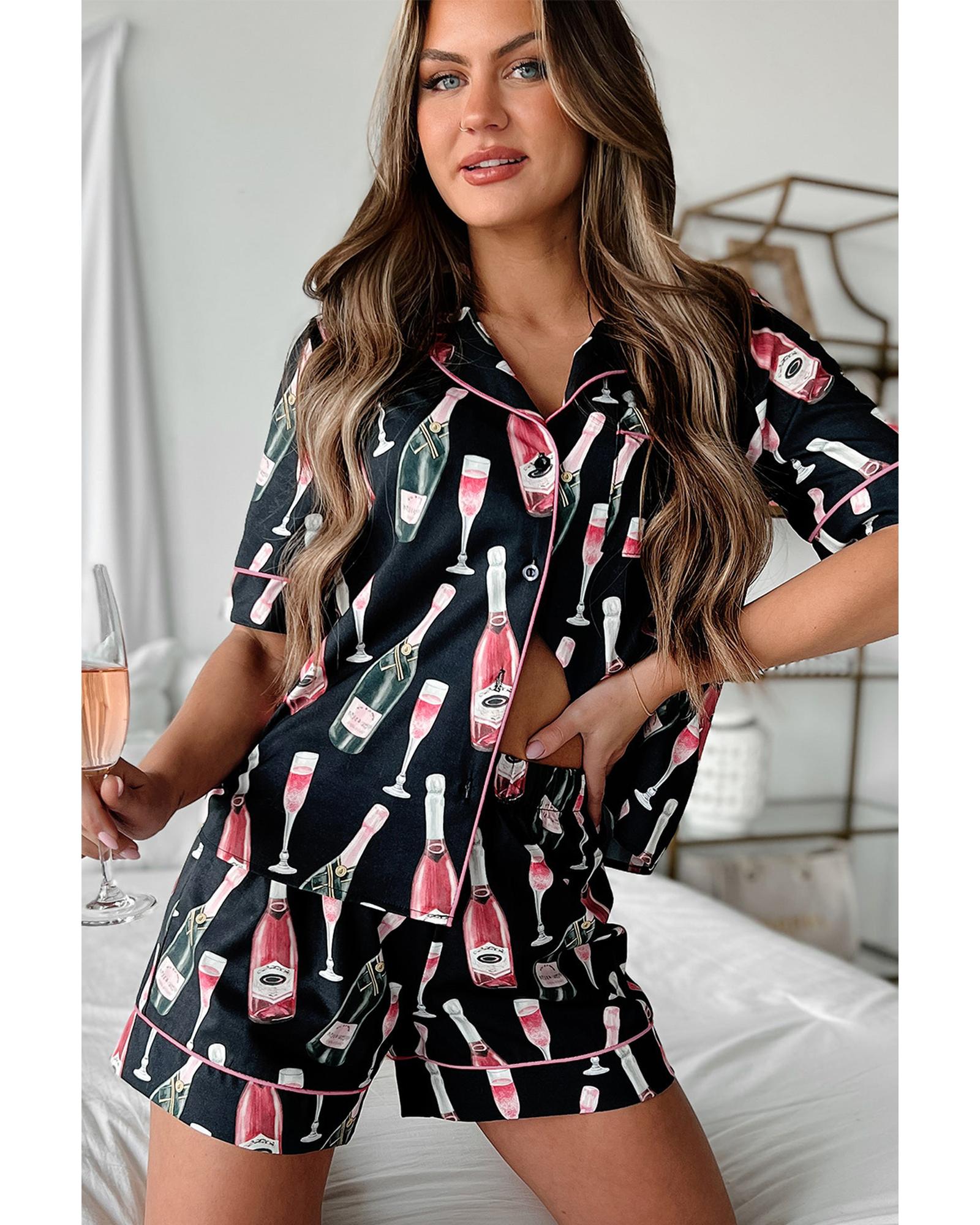 Black Champagne Print Silky Short Sleeve Pajamas Set – L
