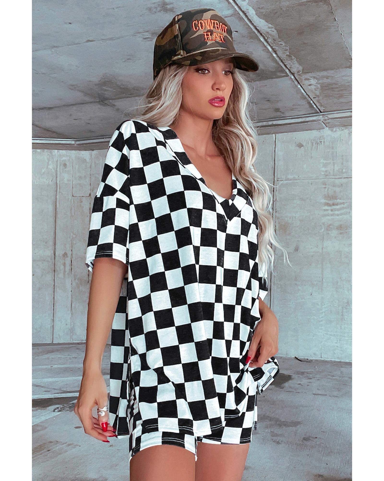 Black Checkerboard Print V Neck Loose Tee and Shorts Lounge Set – L