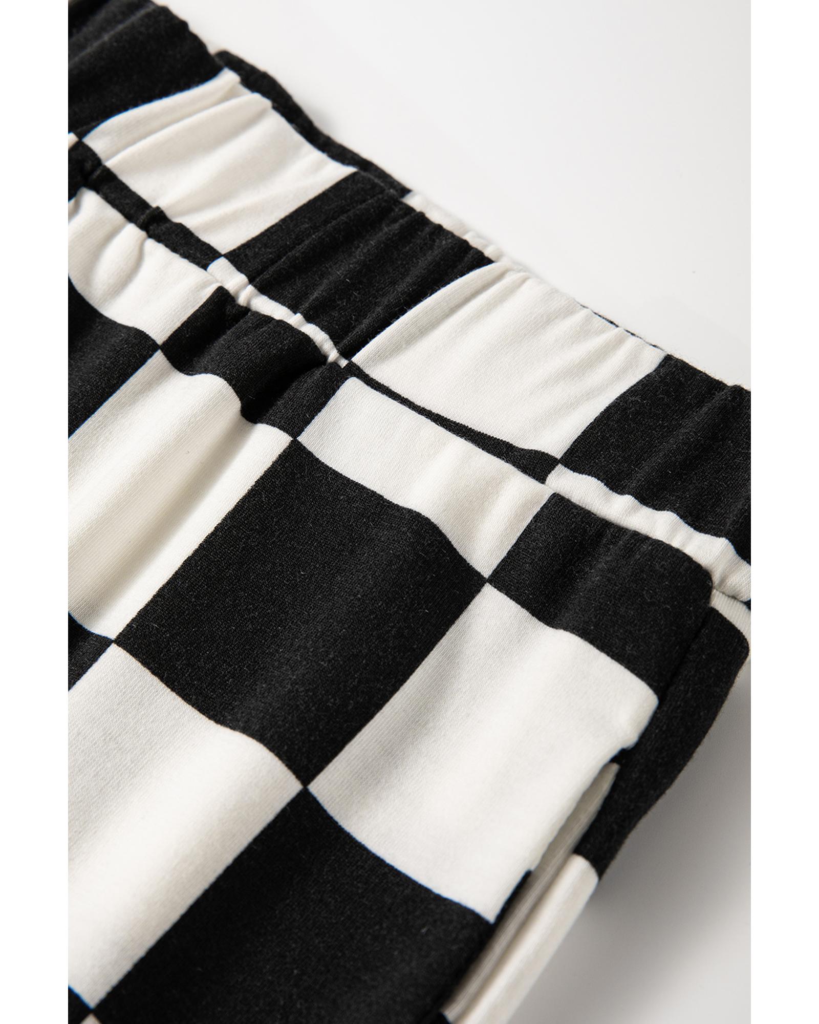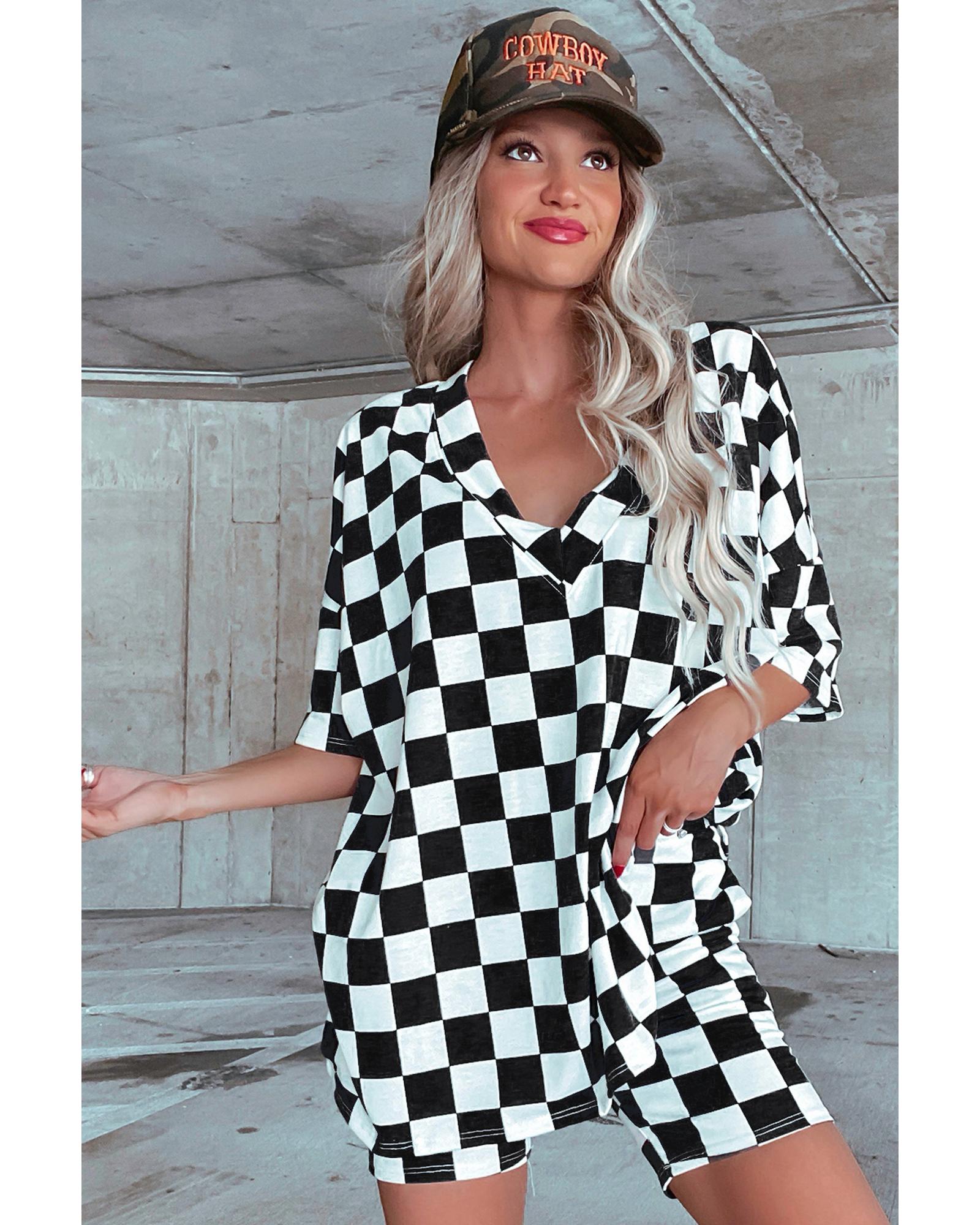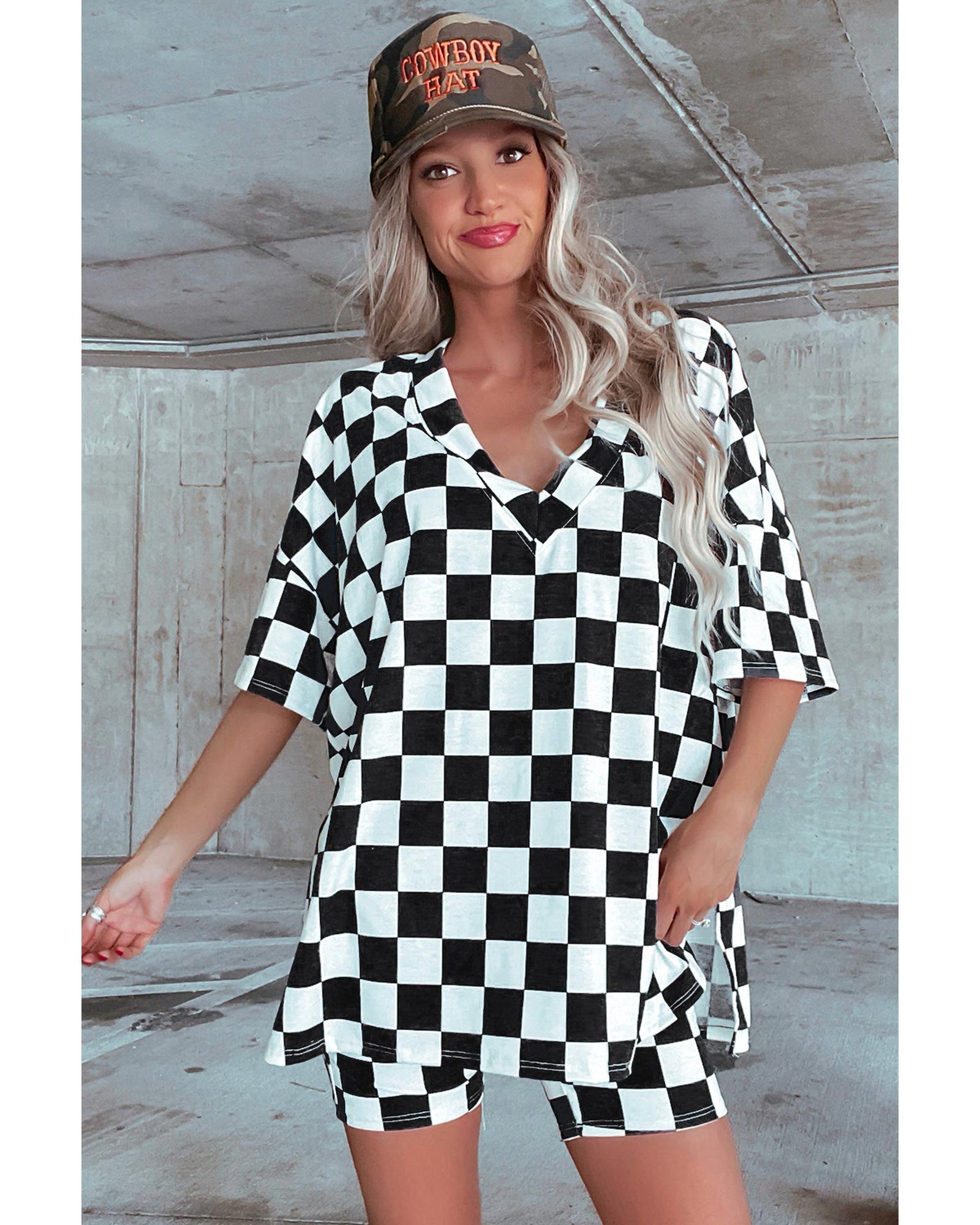 Black Checkerboard Print V Neck Loose Tee and Shorts Lounge Set – M