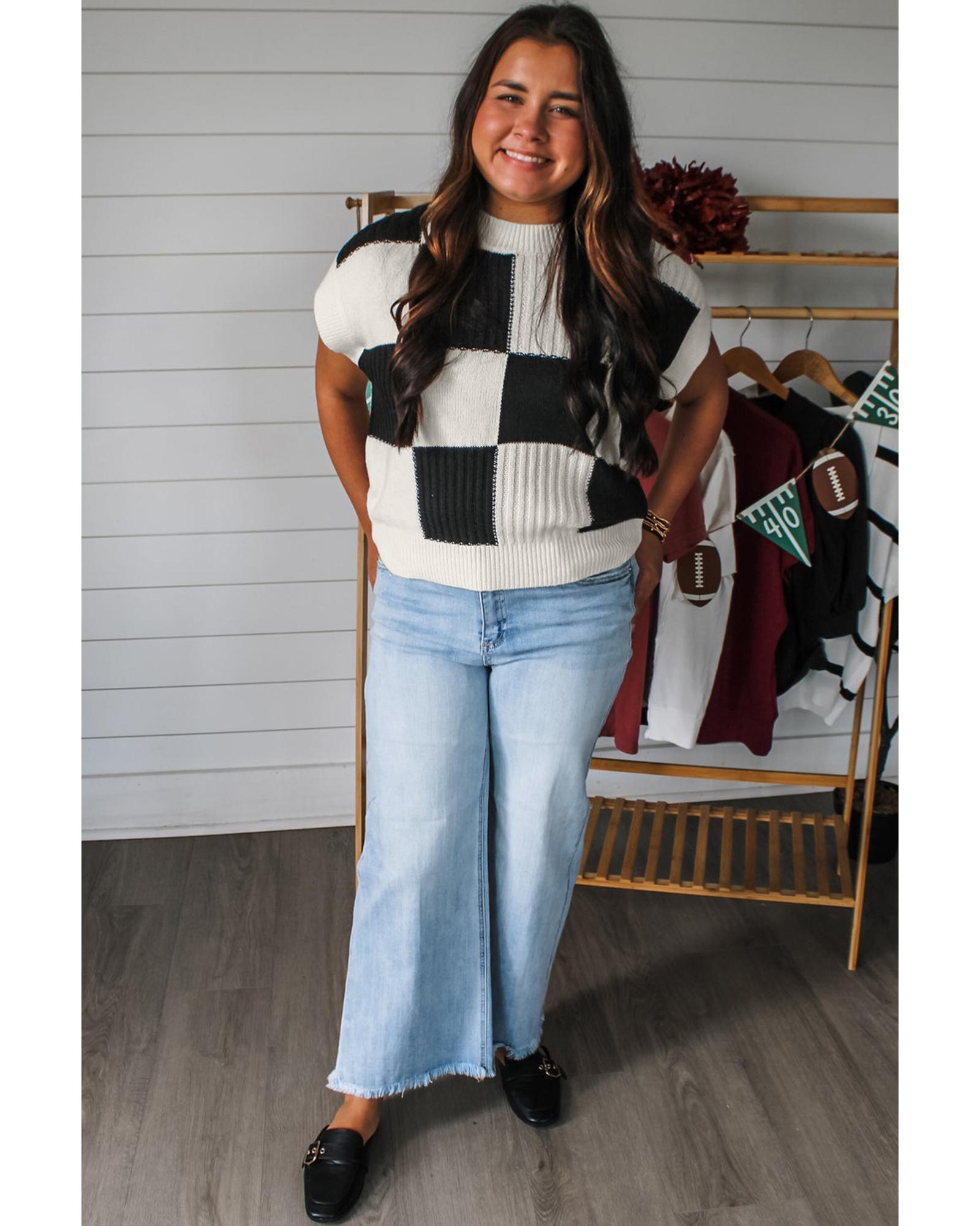 Black Checkered Color Block Crew Neck Short Sleeve Sweater – L