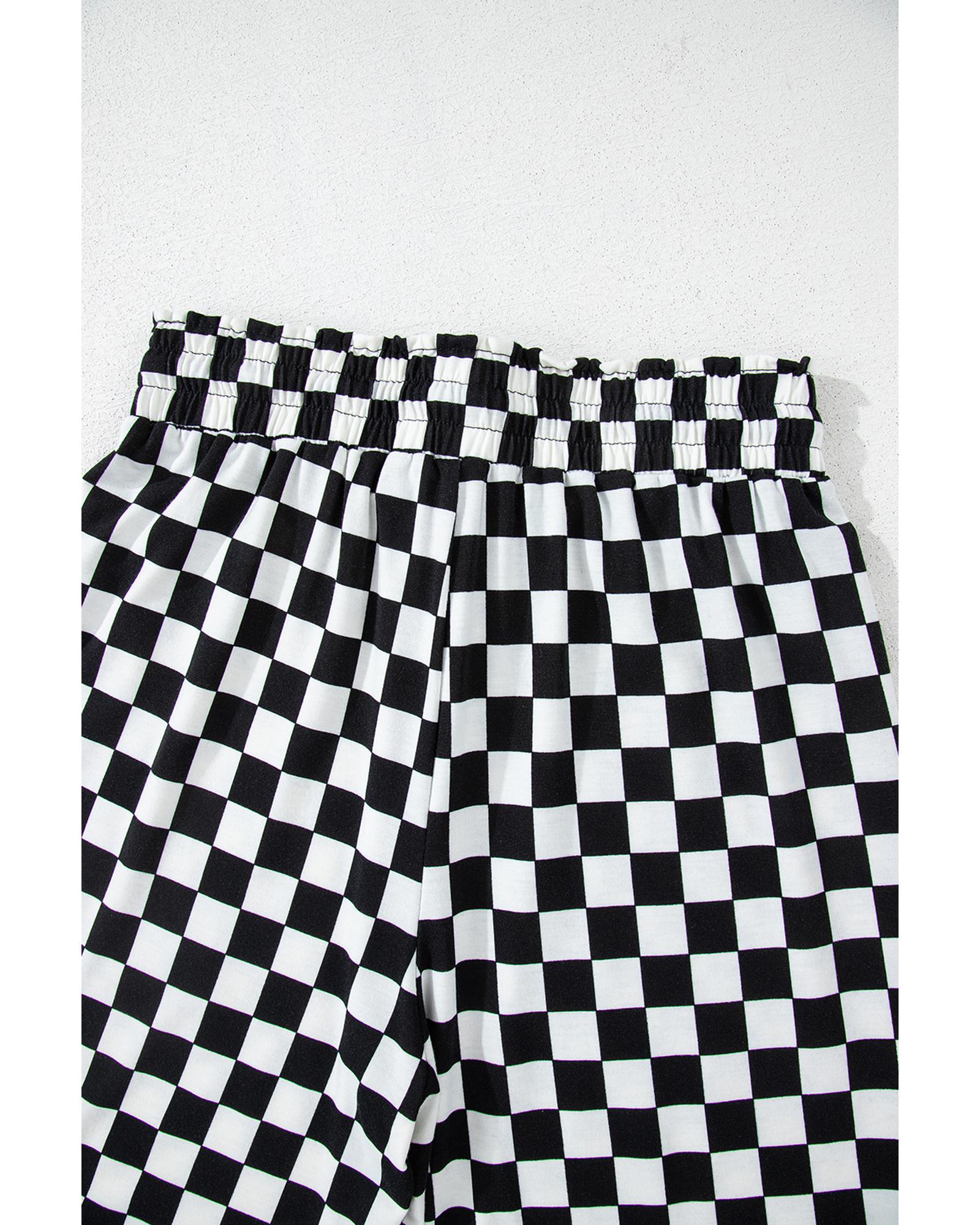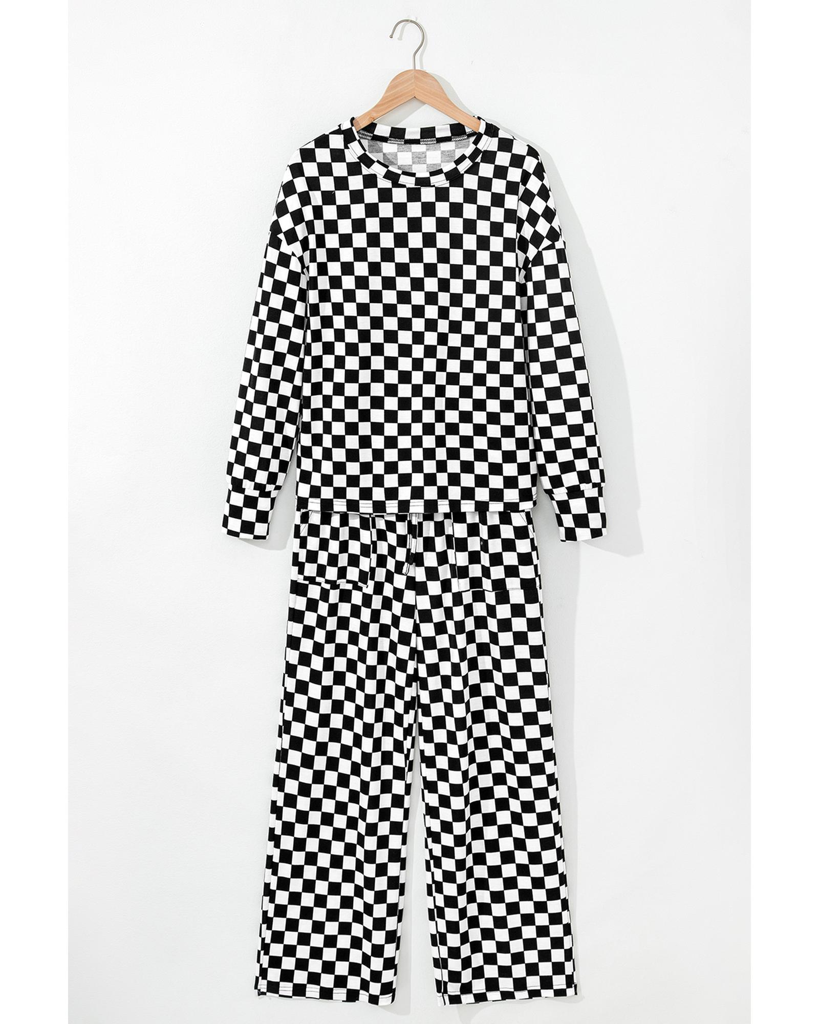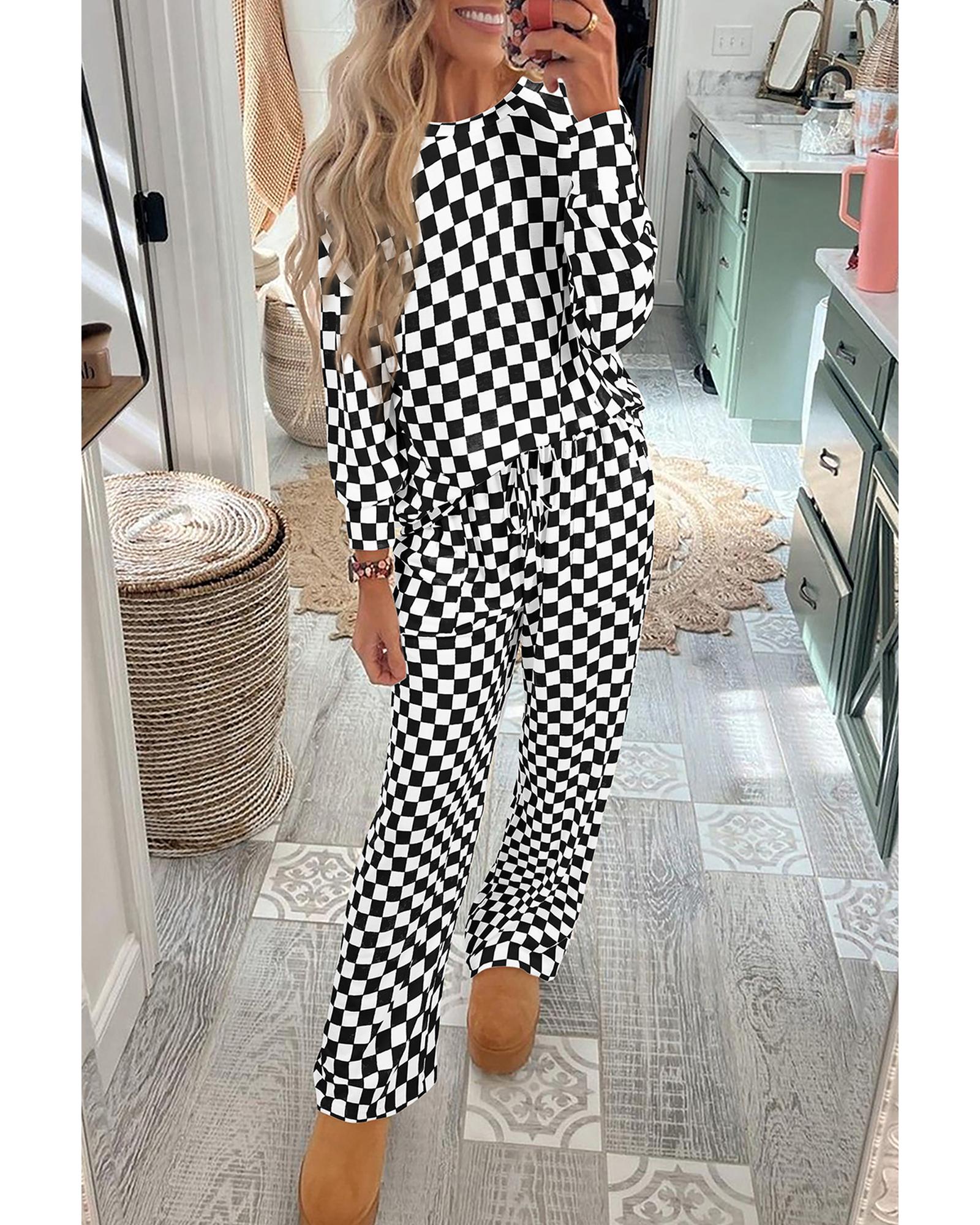 Black Checkered Print Long Sleeve Top and Pants Lounge Set – S