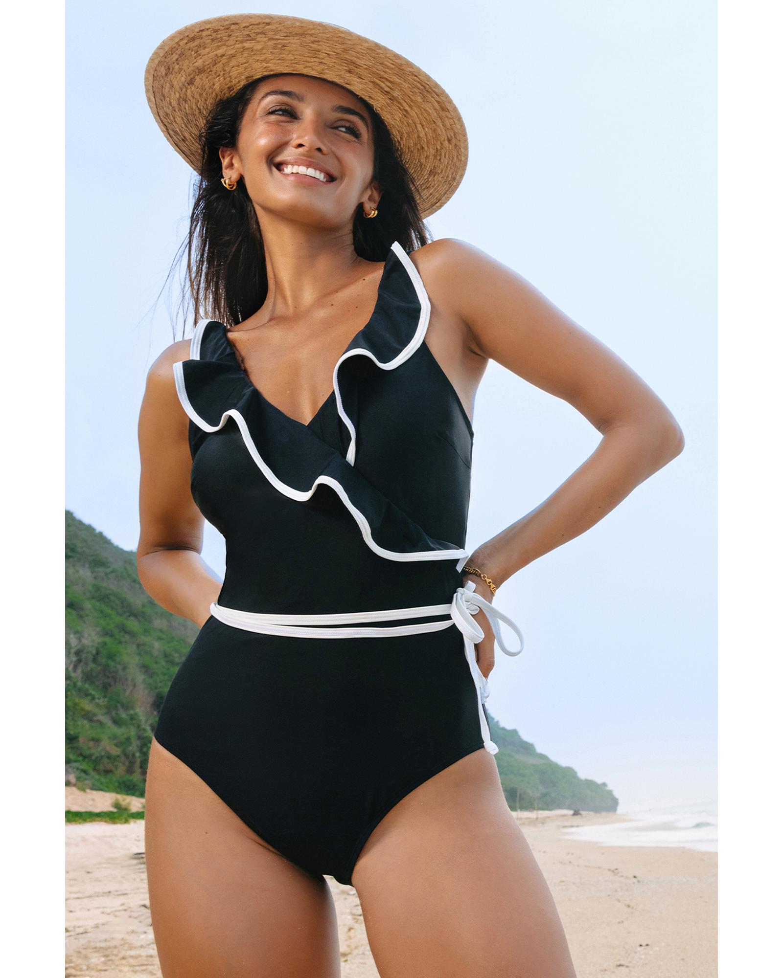 Black Color Contrast Ruffled Wrap V Neck Swimsuit – S