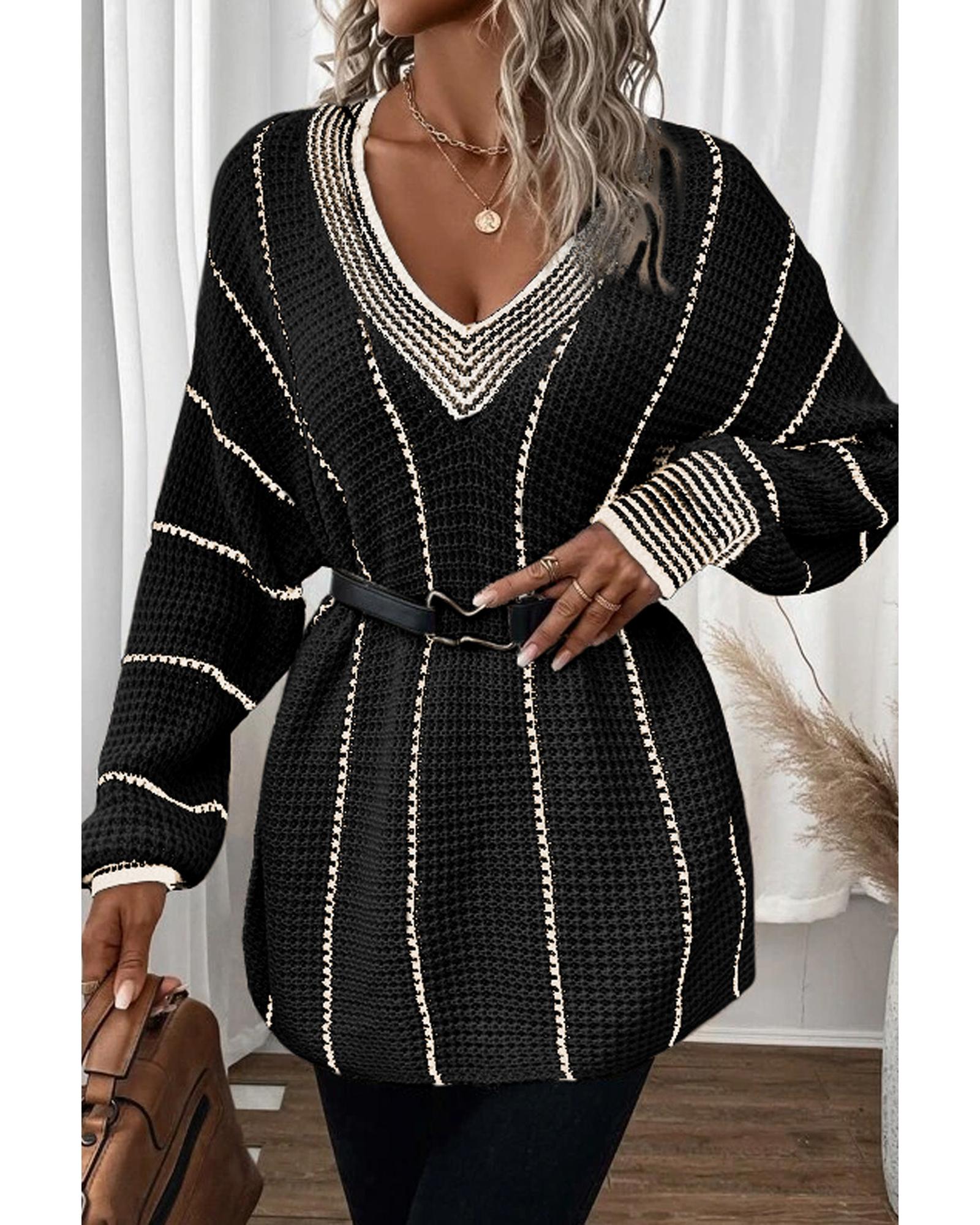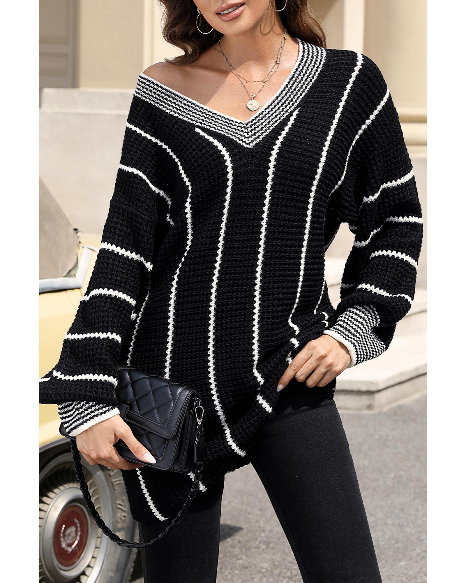 Black Colorblock Striped V Neck Knitted Loose Sweater – M