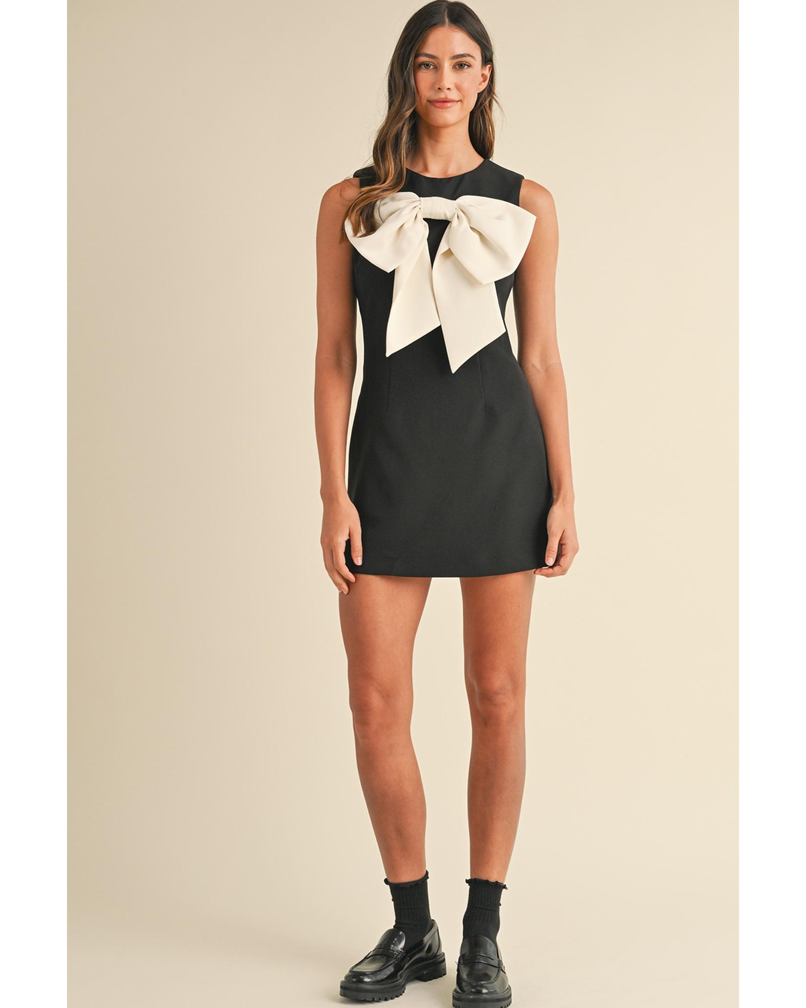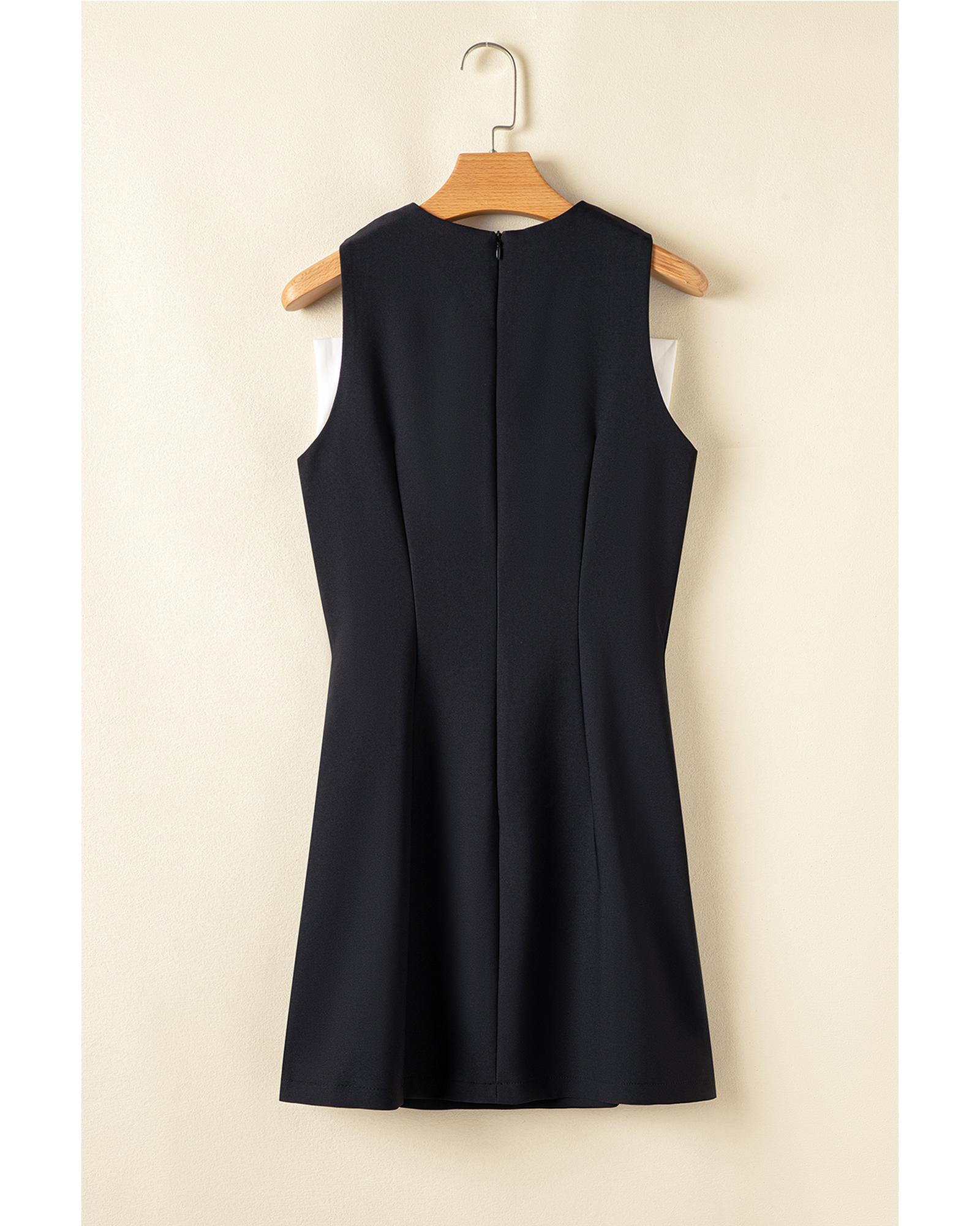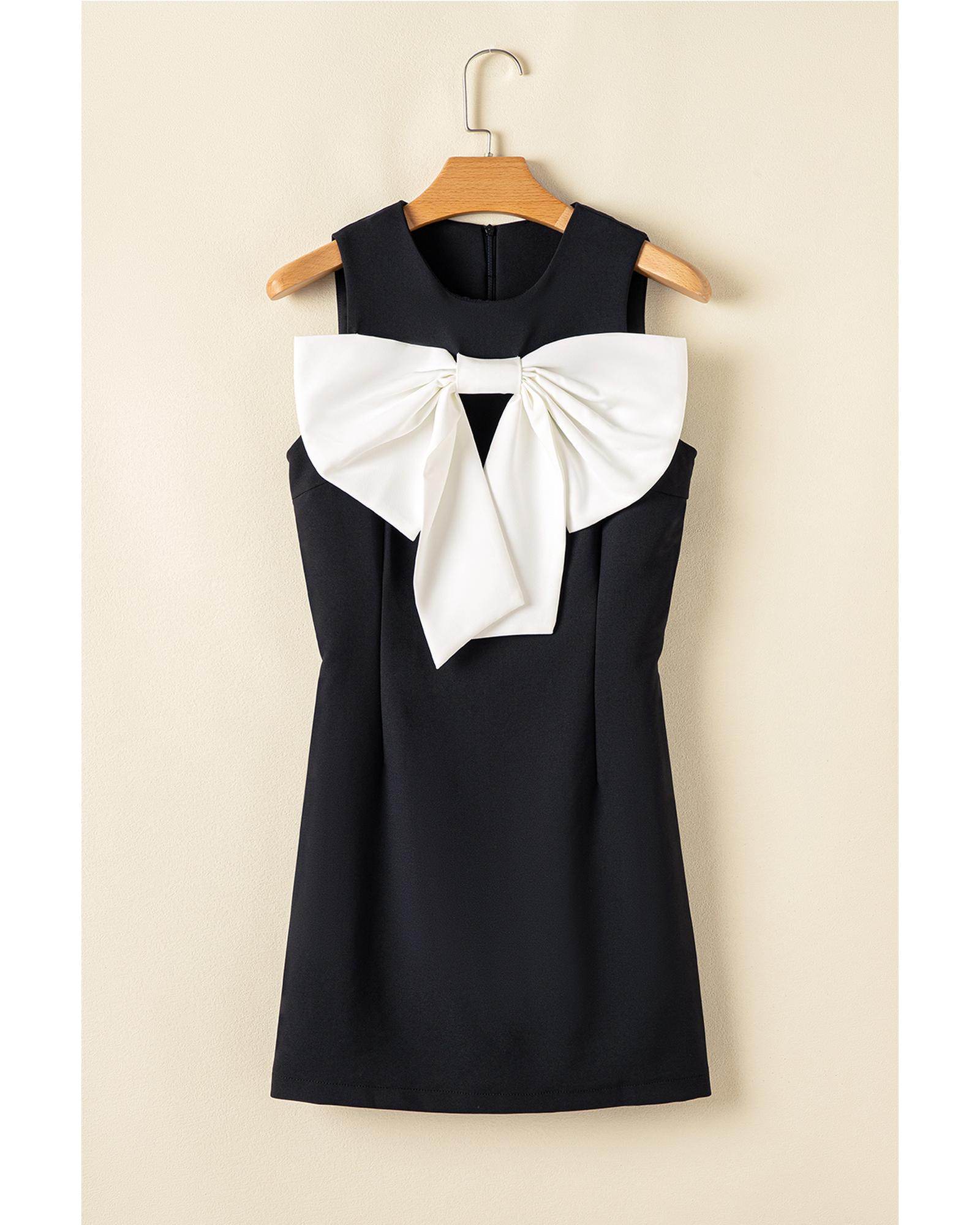 Black Contrast Bowknot Applique Crew Neck Sleeveless Mini Dress – L