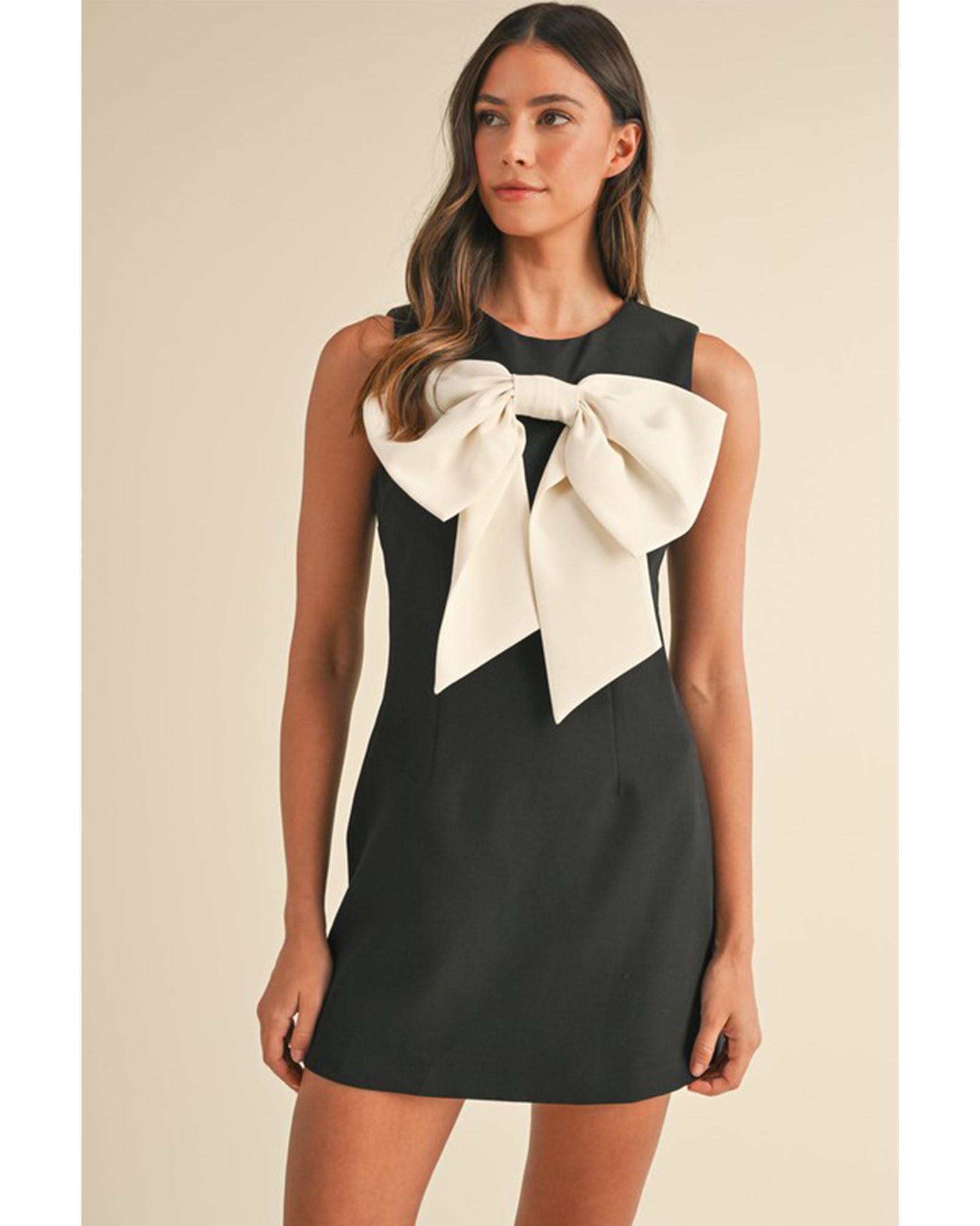 Black Contrast Bowknot Applique Crew Neck Sleeveless Mini Dress – S