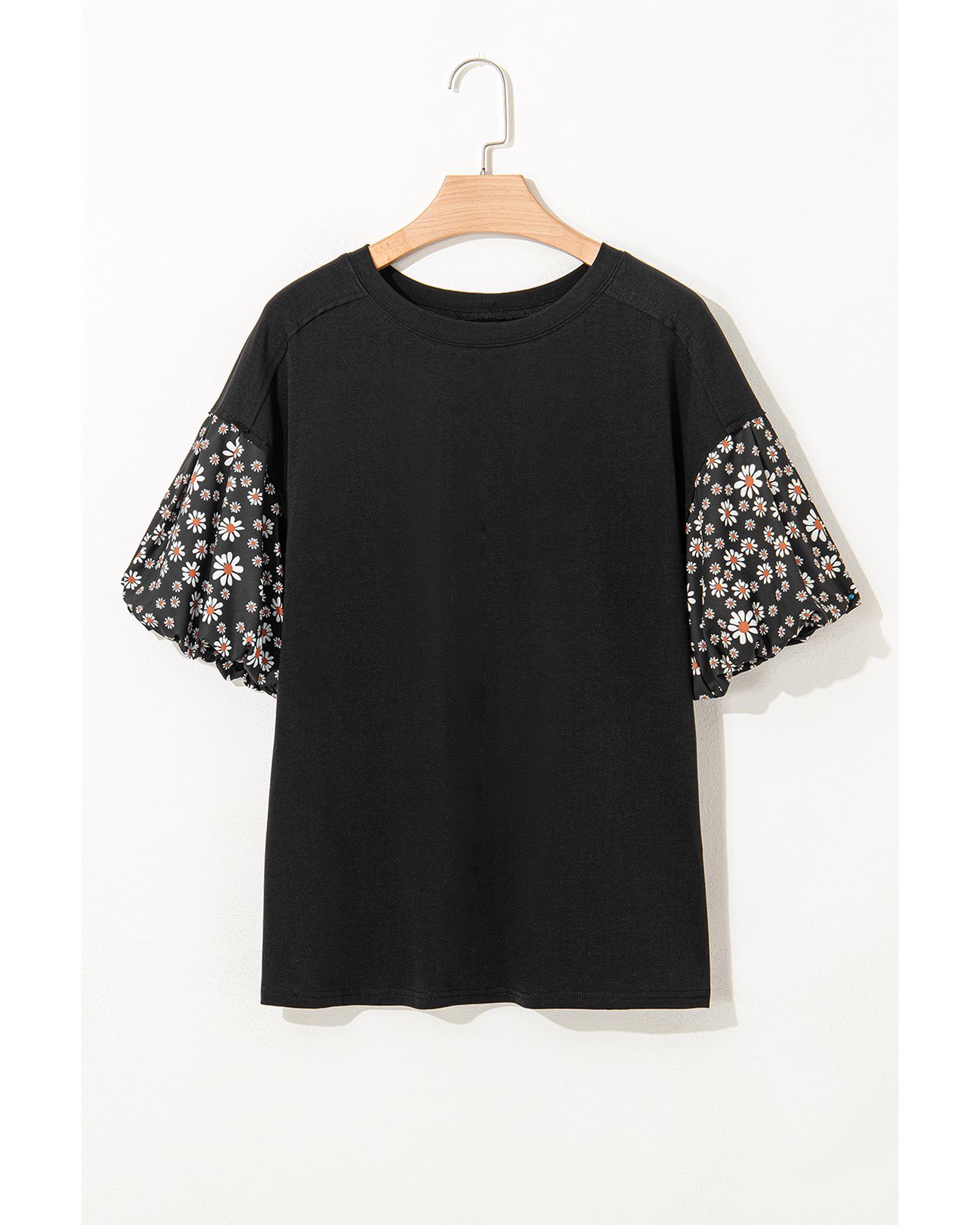 - Black Contrast Floral Puff Sleeve Oversized Top