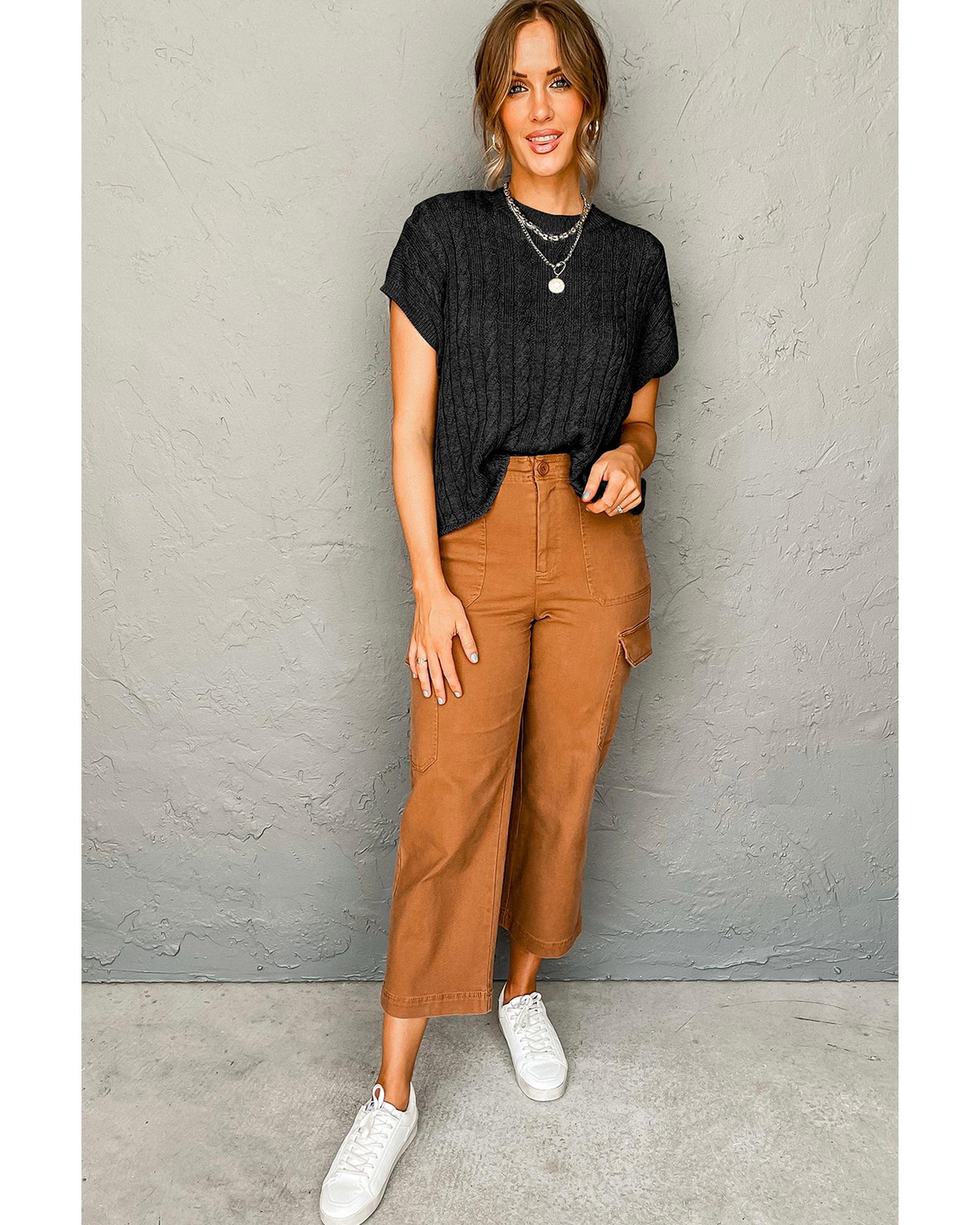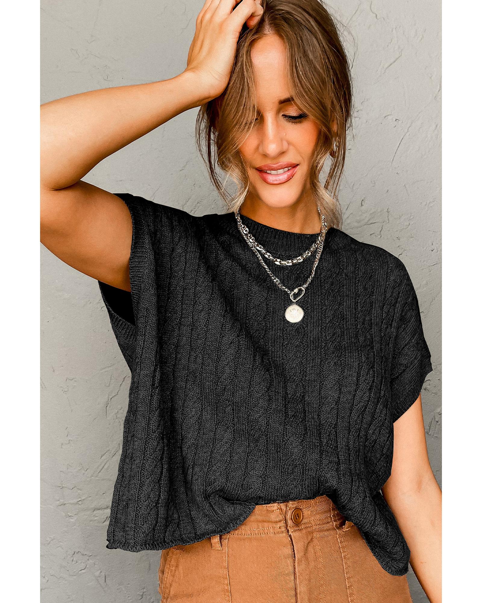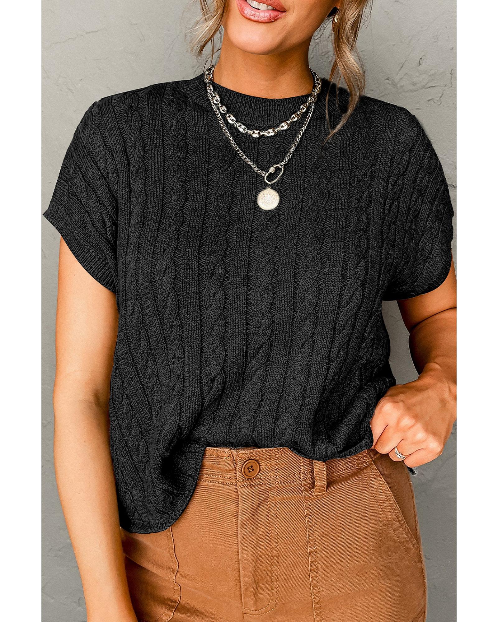 Black Crew Neck Cable Knit Short Sleeve Sweater – L