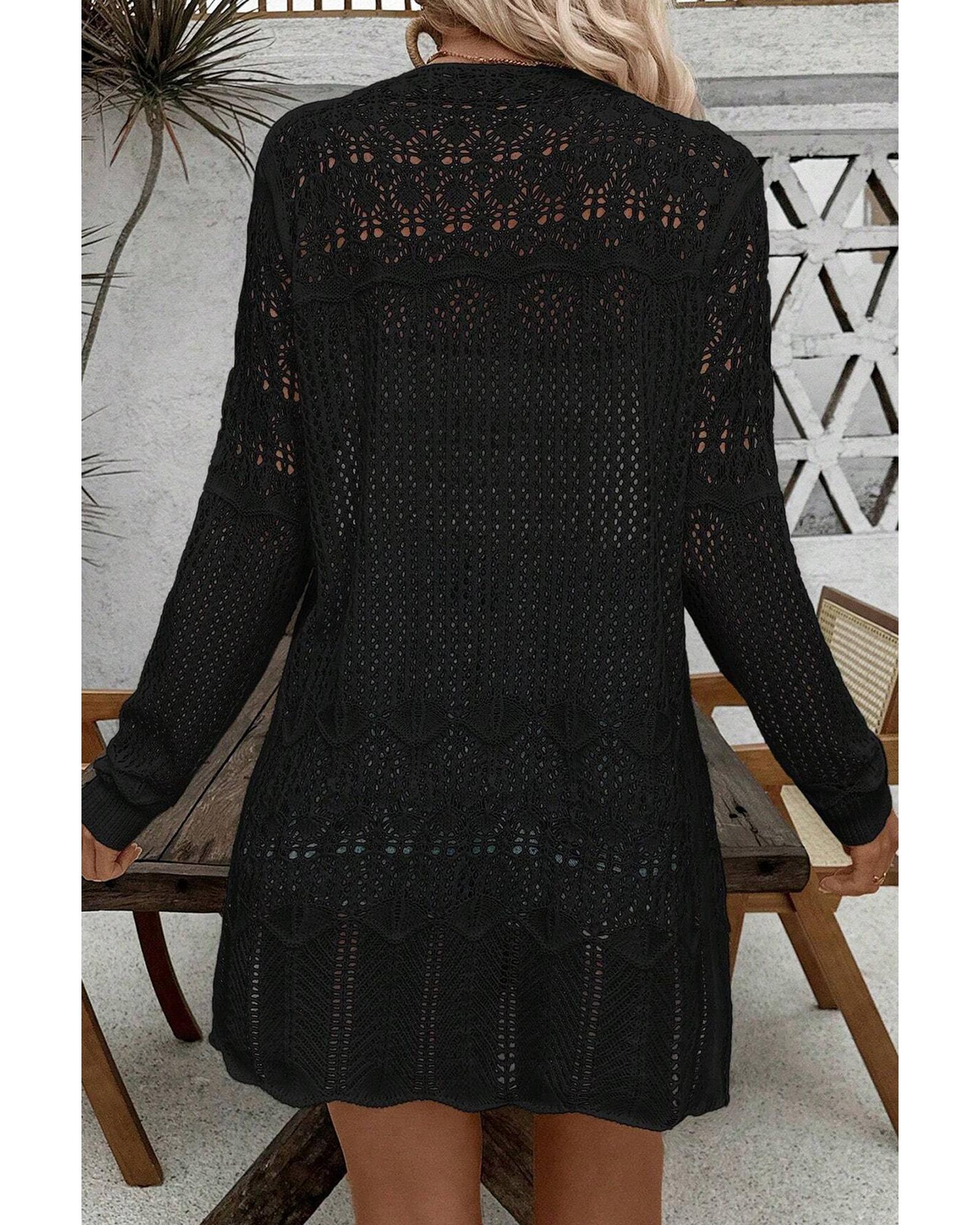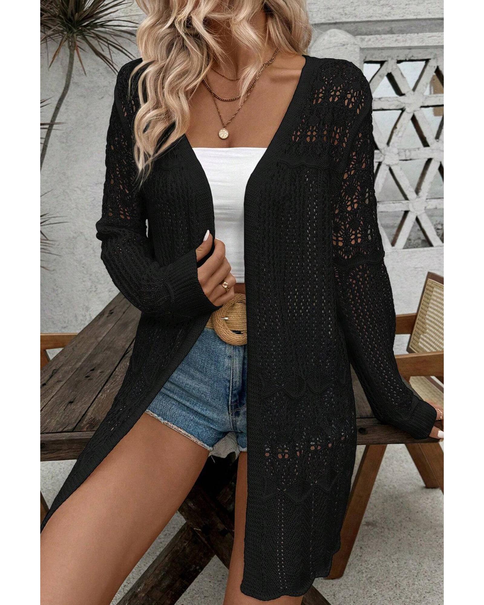 Black Crochet Hollow Out Open Front Cardigan – L