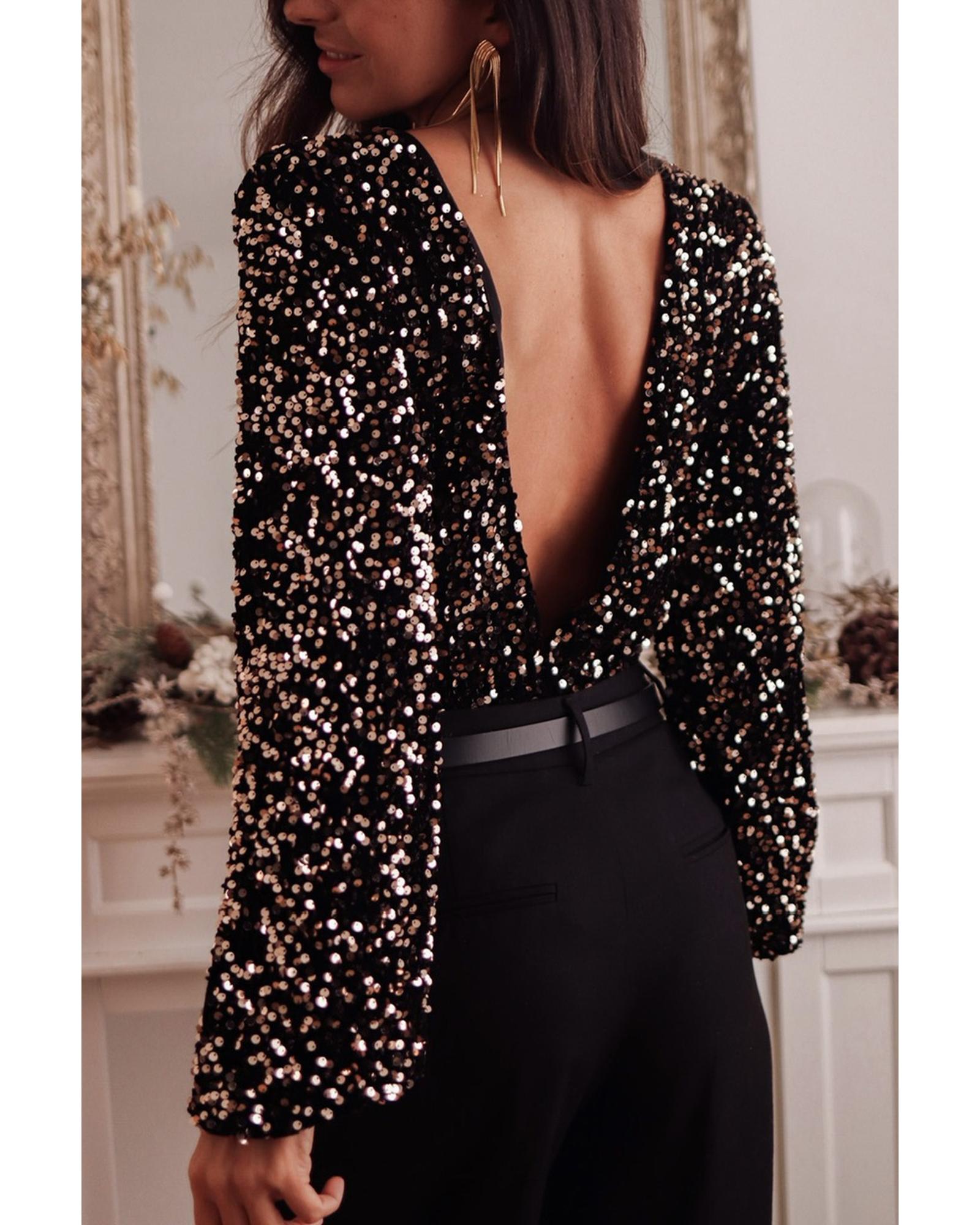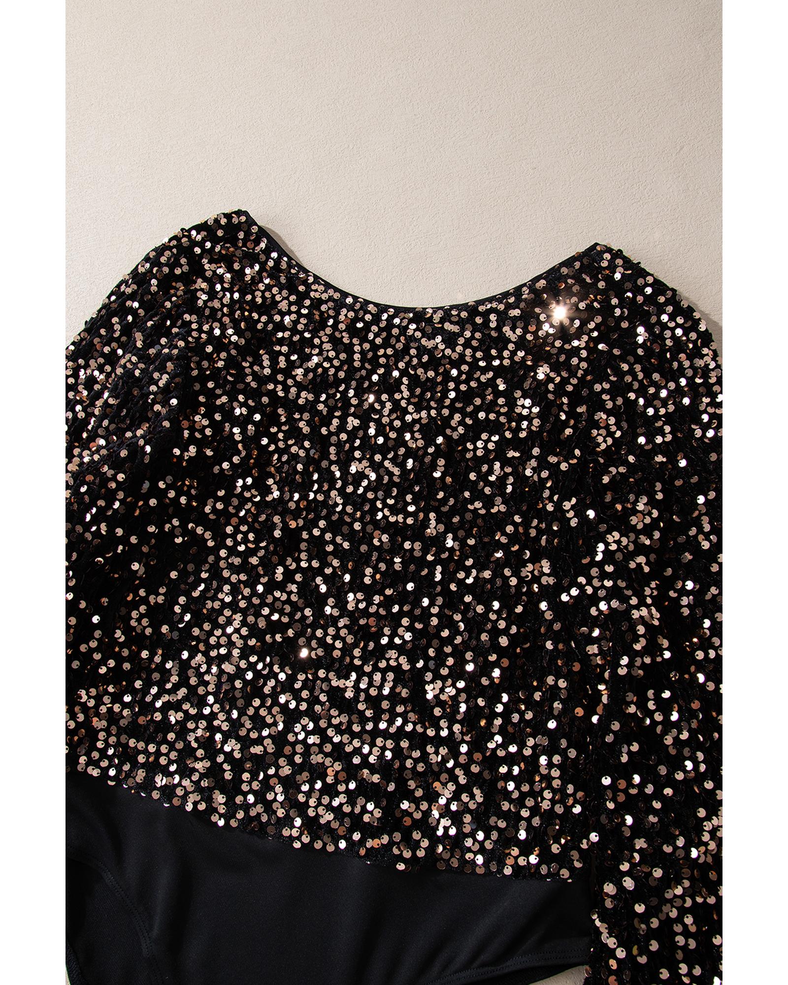 Black Deep V Back Sequin Puff Sleeve Bodysuit – S