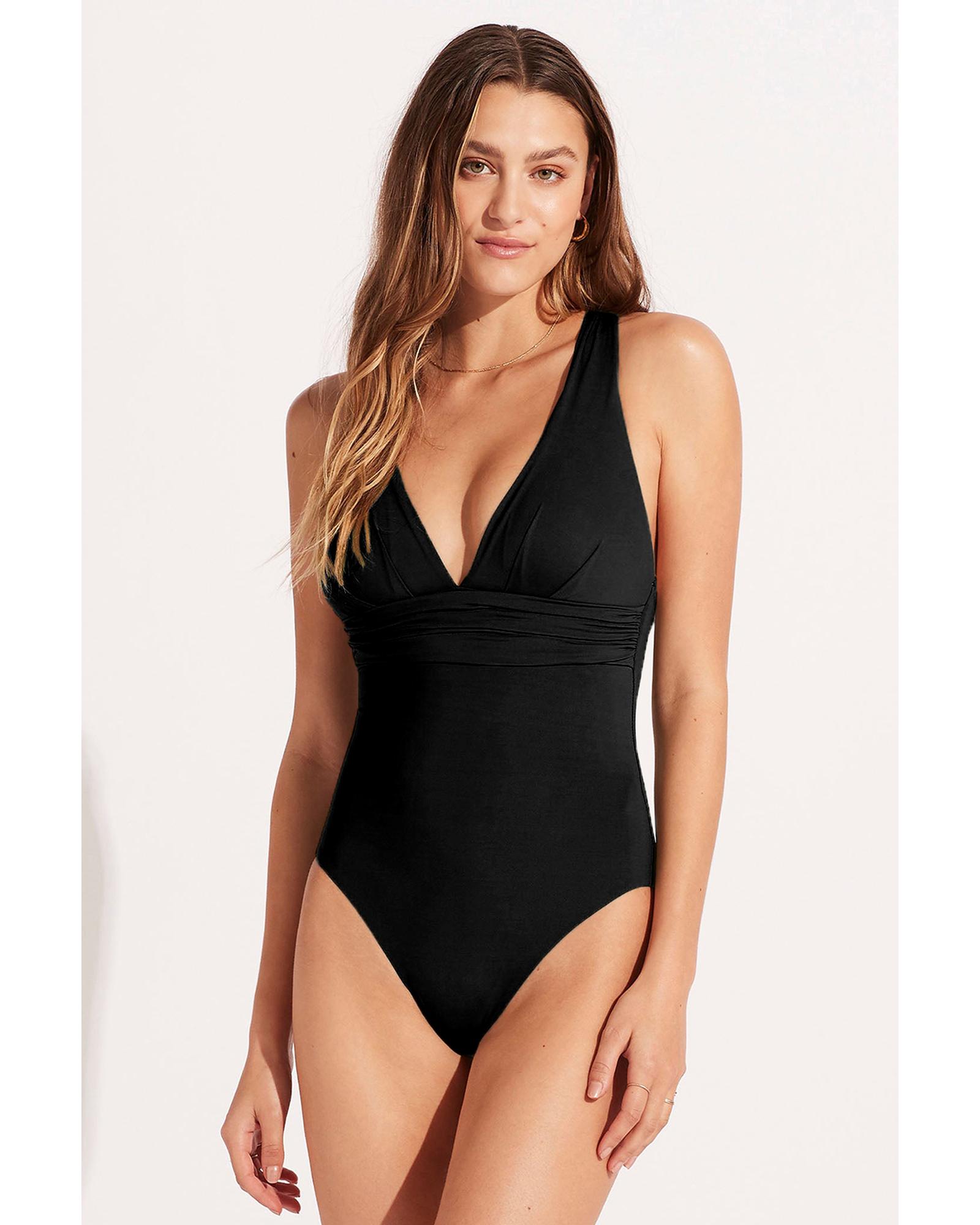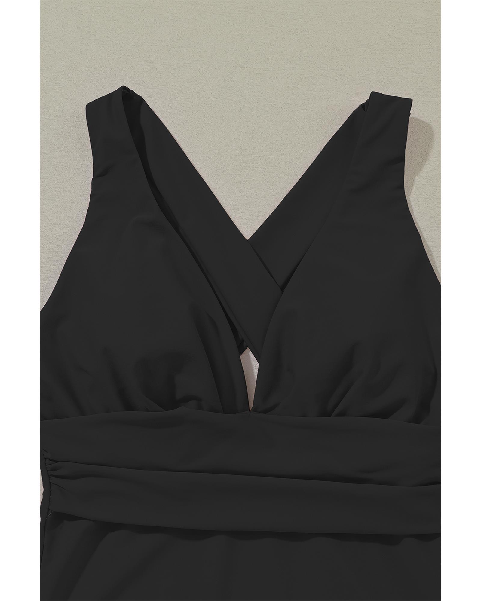 Black Deep V Neck Crossover Backless Ruched High Cut Monokini – XL