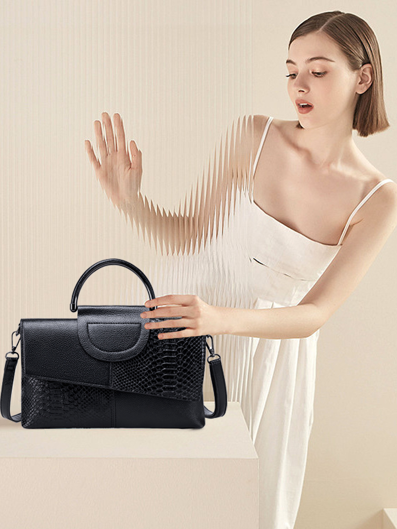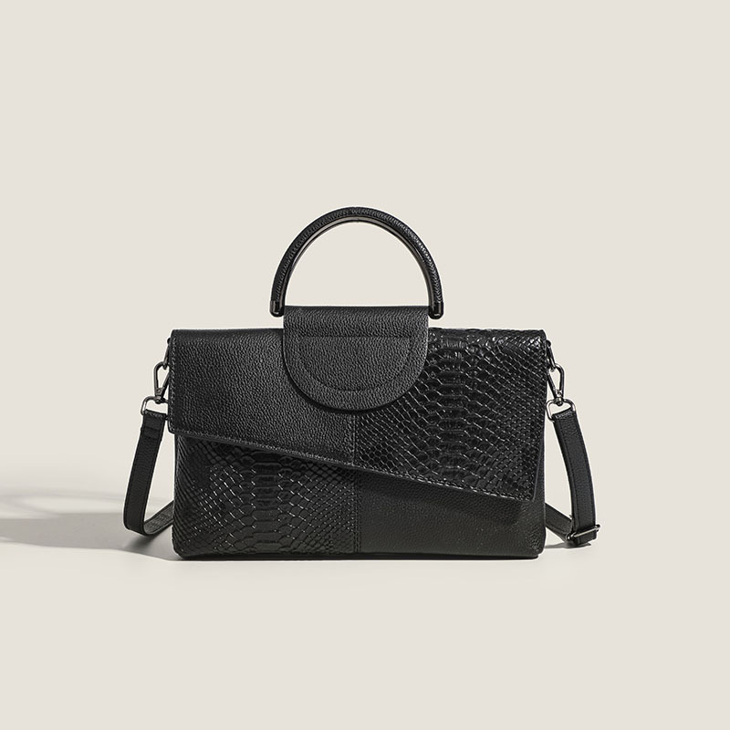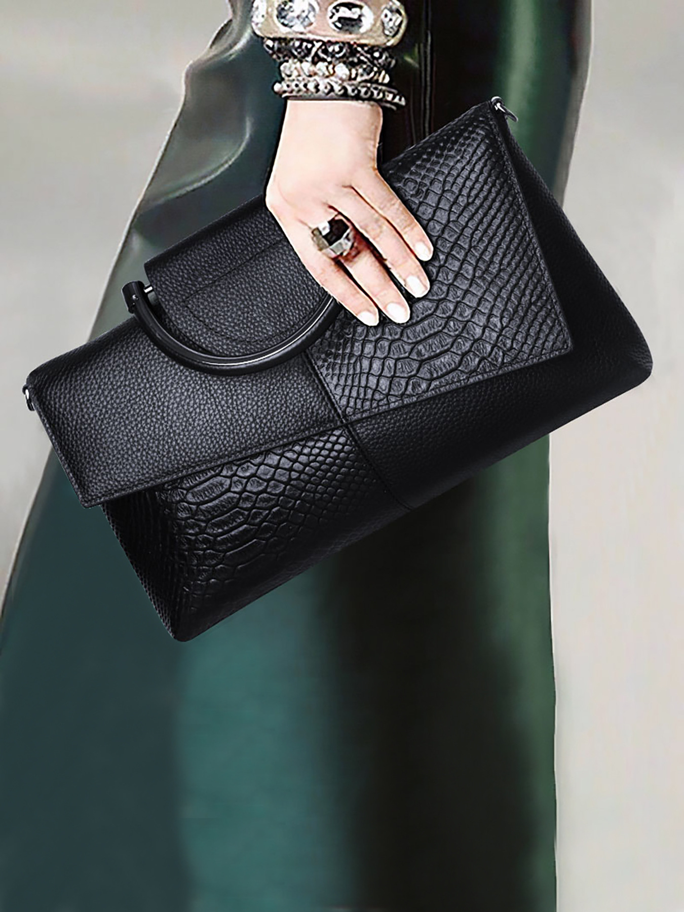 Elevate your style with this exquisite clutch bag, designed for the modern woman who appreciates timeless elegance. The bag features a sophisticated combination of smooth and crocodile-embossed leather, creating a luxurious and eye-catching texture. Its structured silhouette and unique metal top handle add a touch of vintage charm.