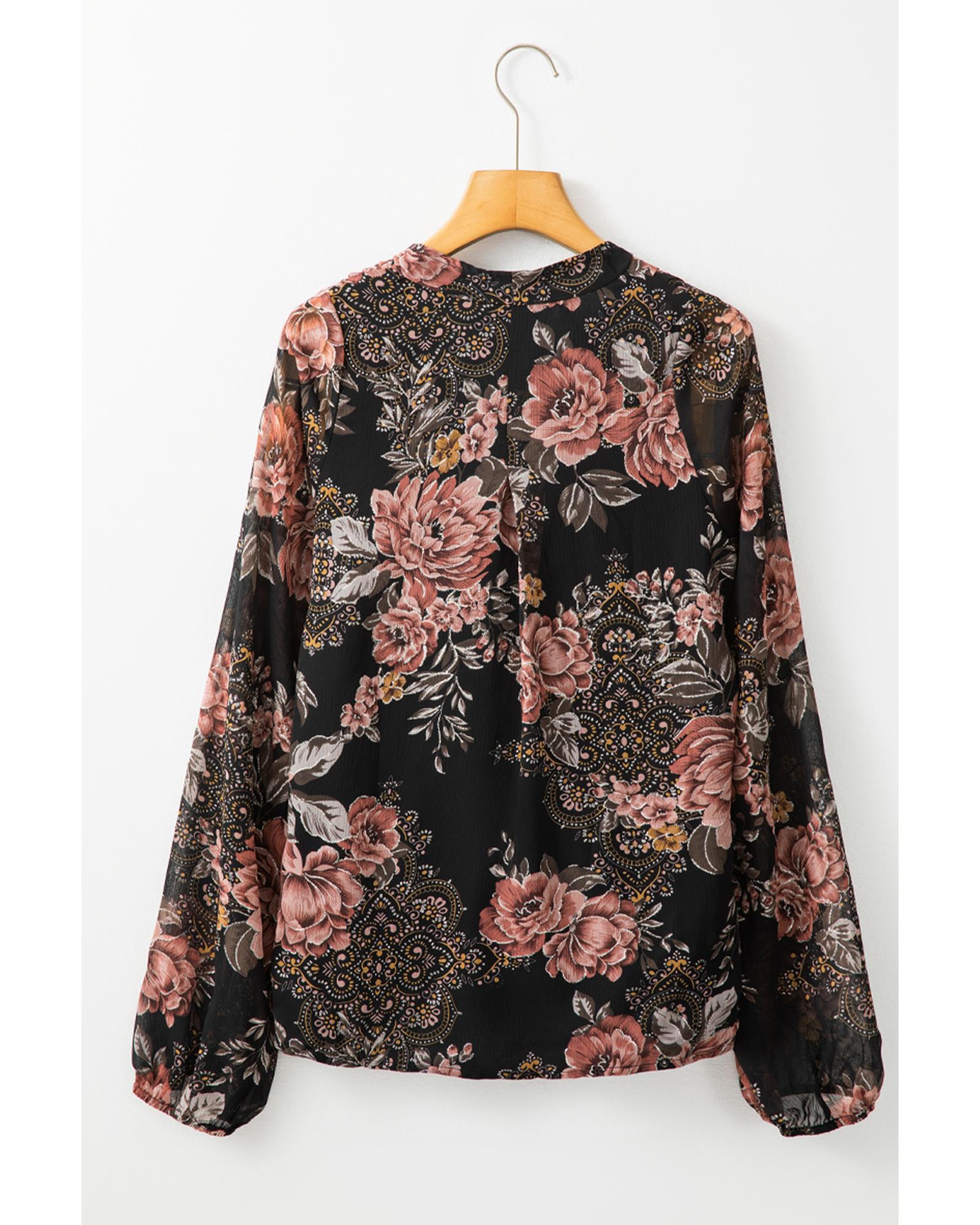 Black Floral Print Criss Cross V Neck Balloon Sleeve Blouse – M