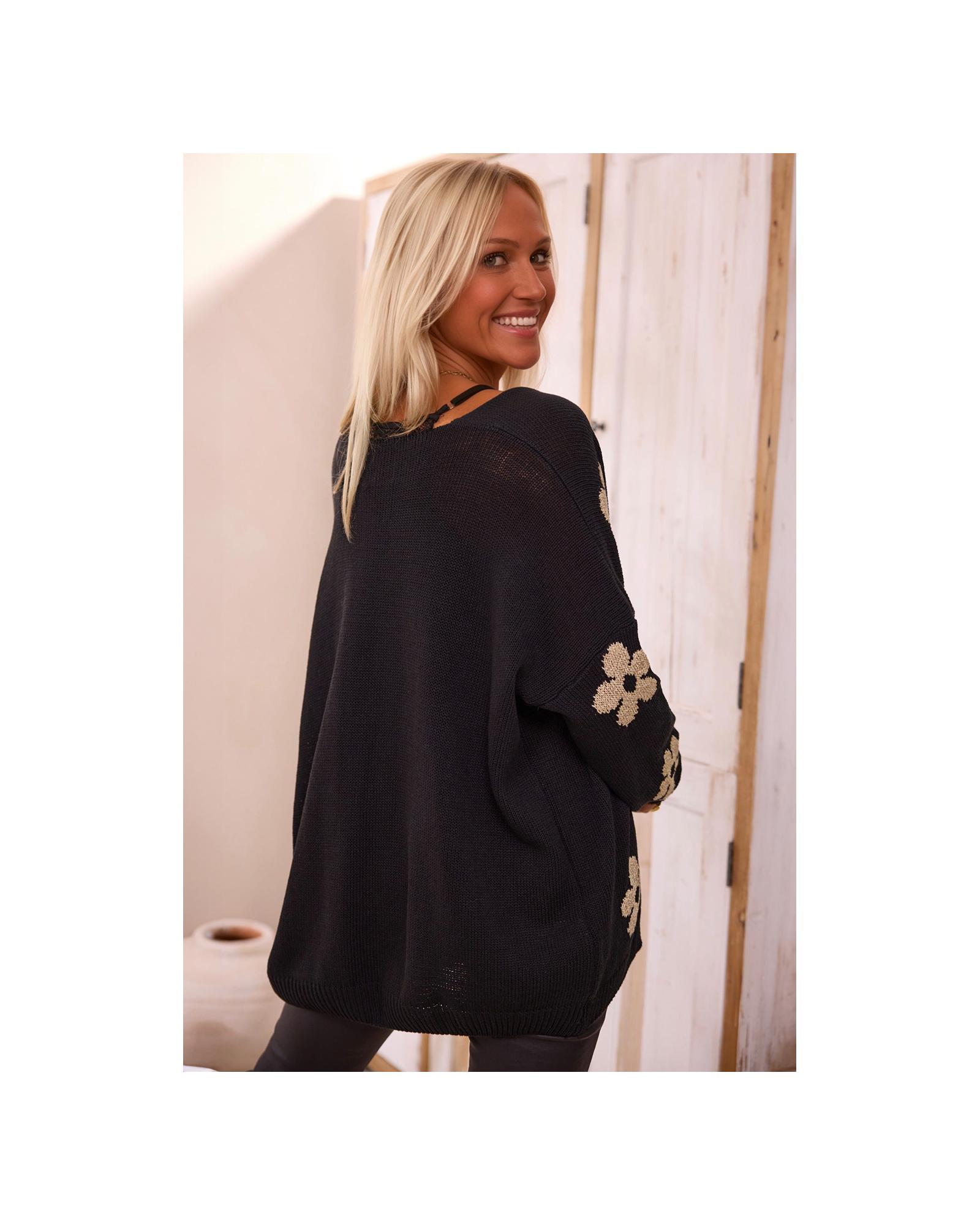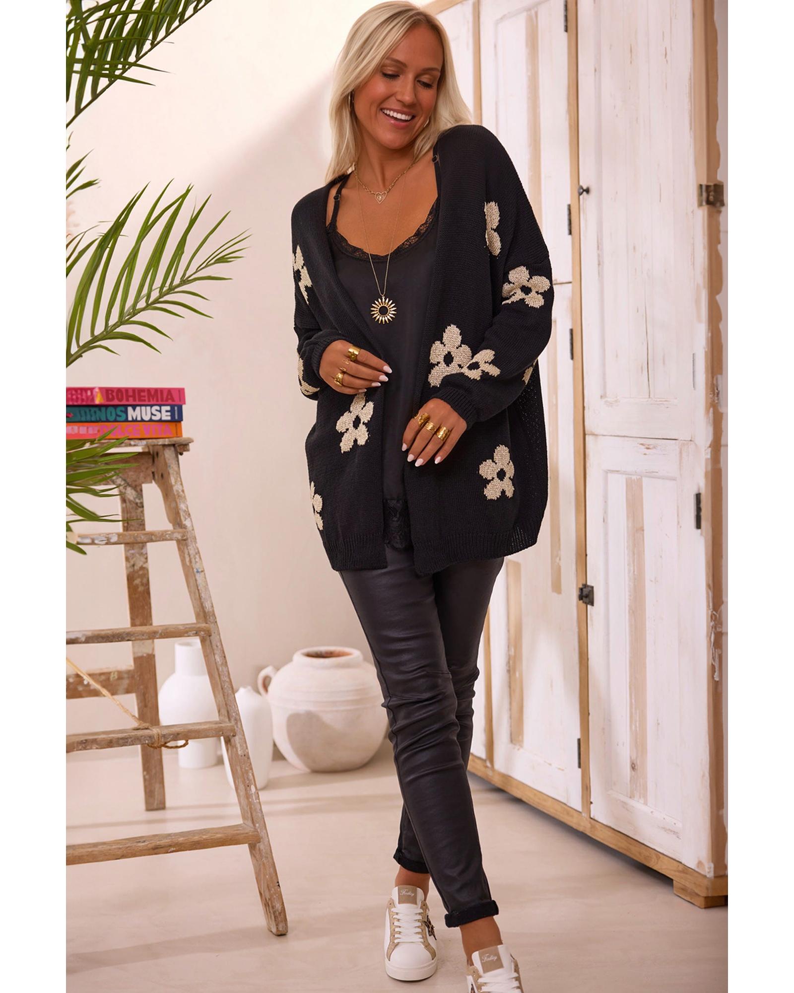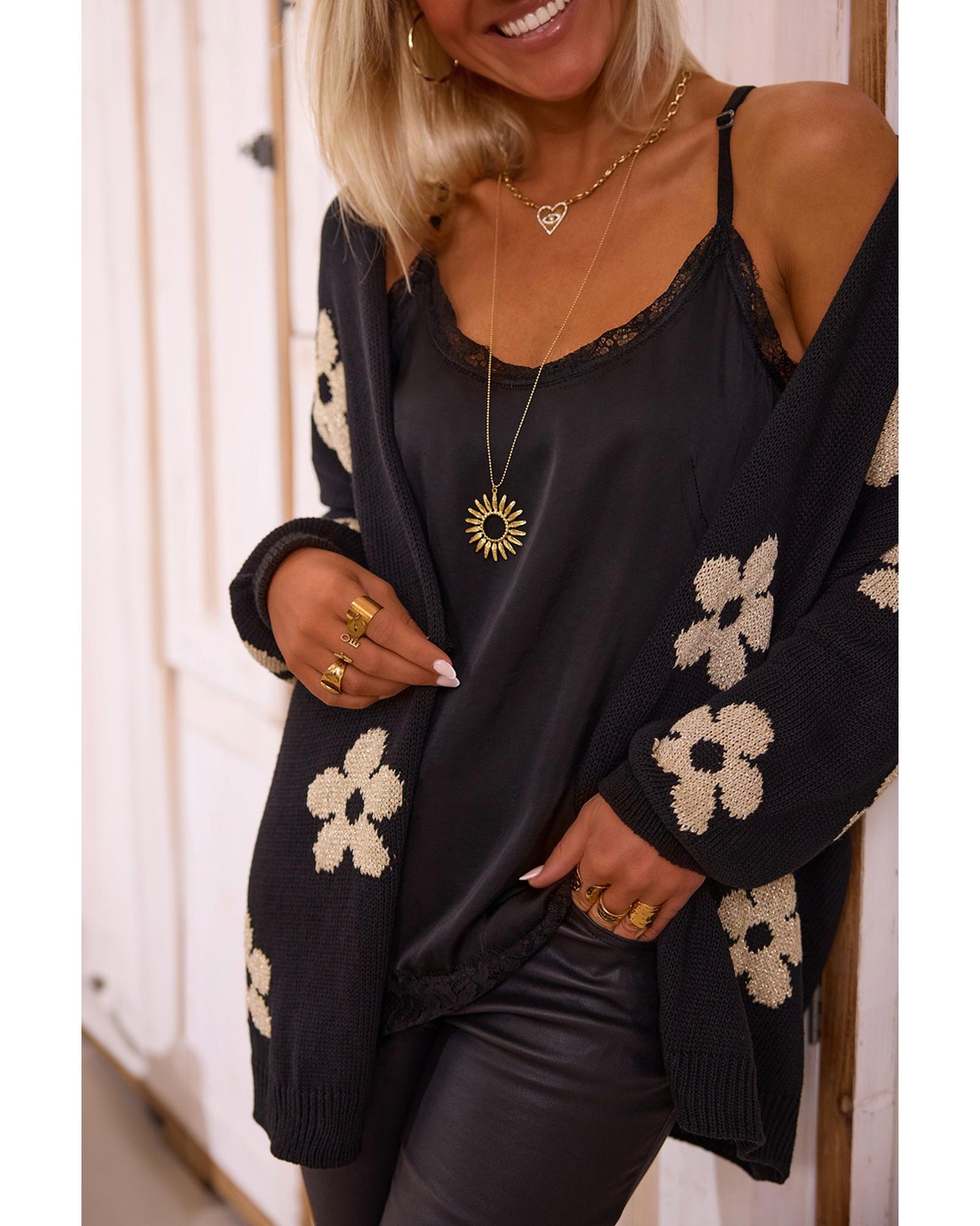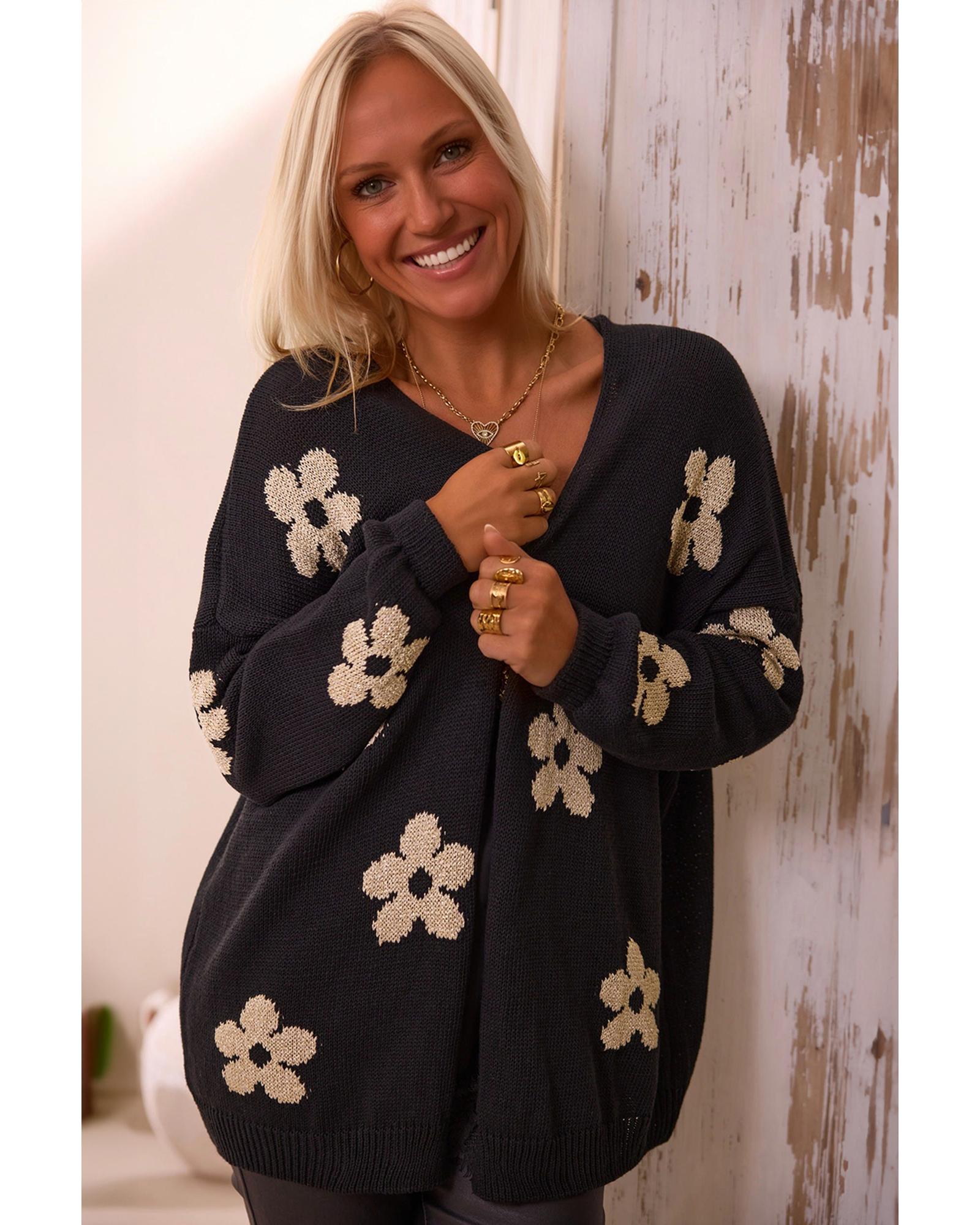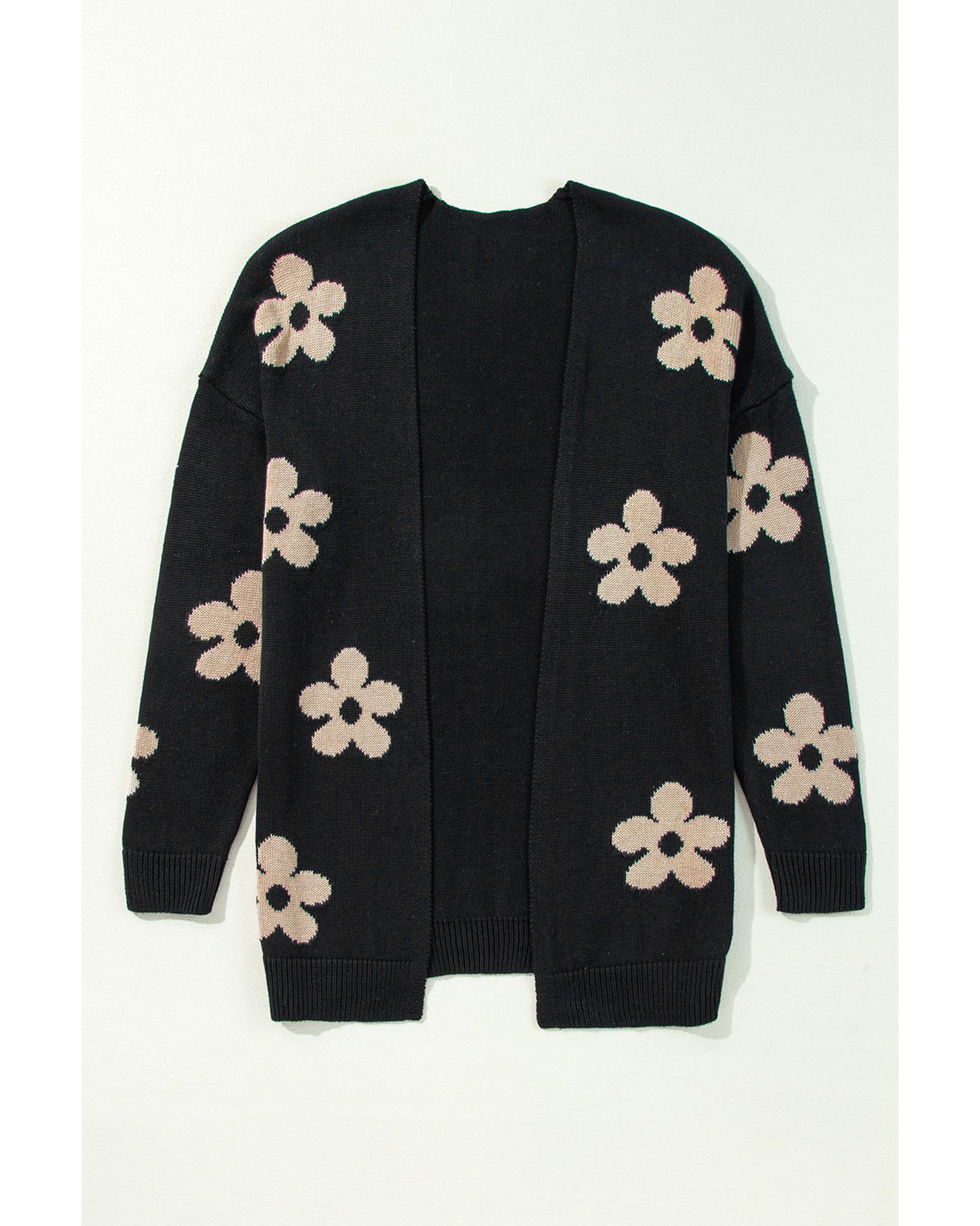 - Black Floral Print Knitted Open Front Loose Cardigan