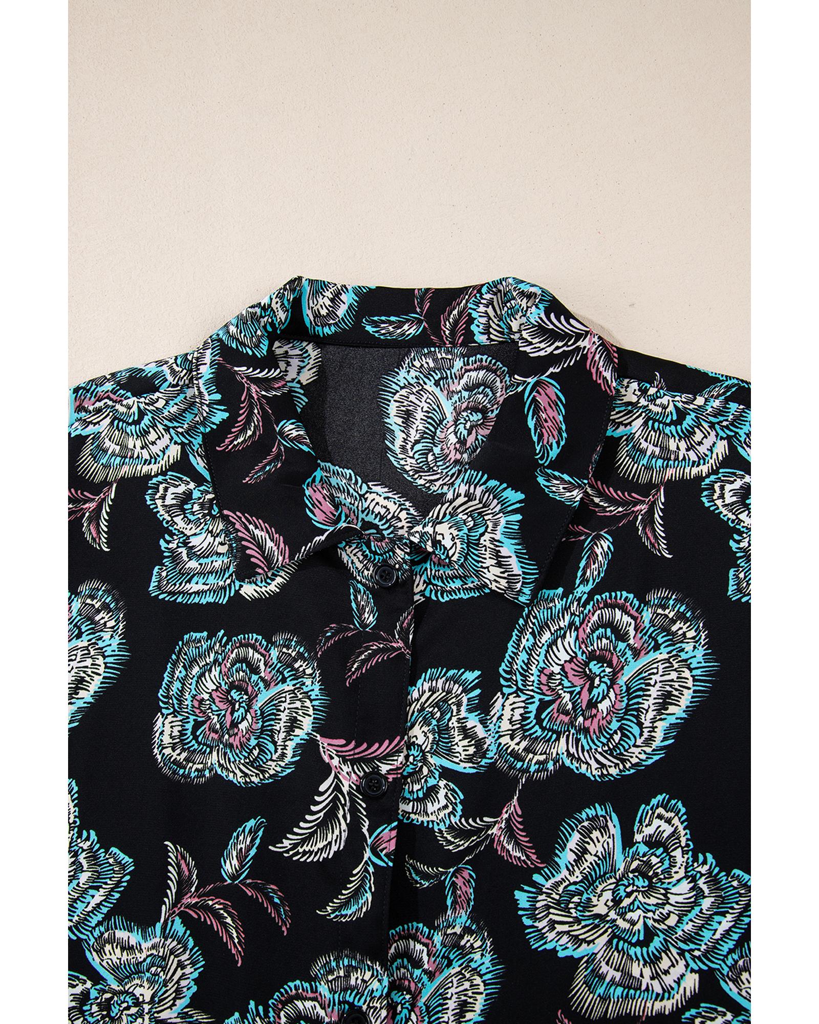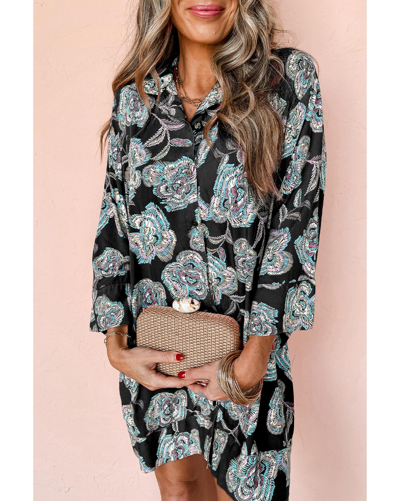 Black Floral Print Lapel Collar Loose Shirt Mini Dress – L