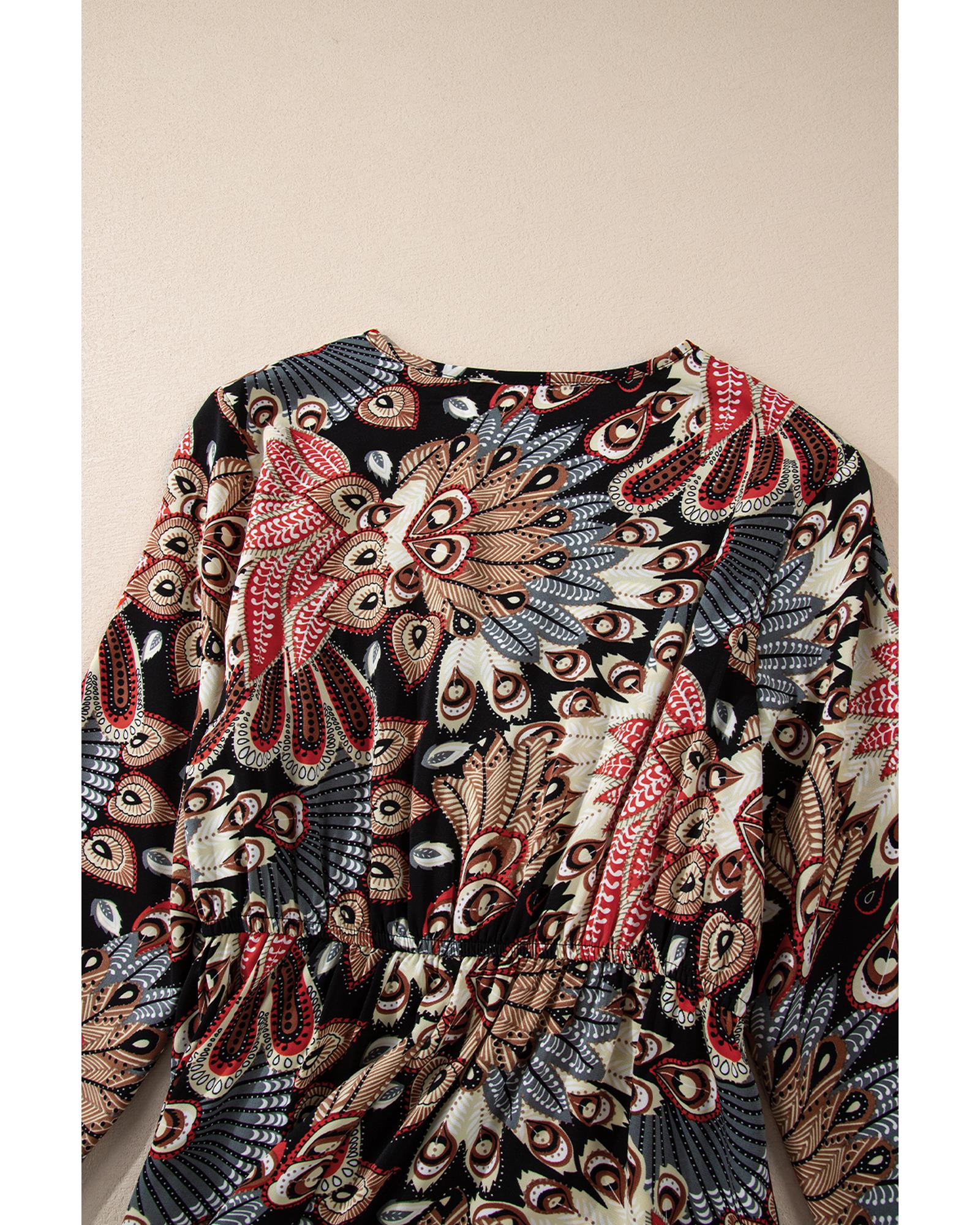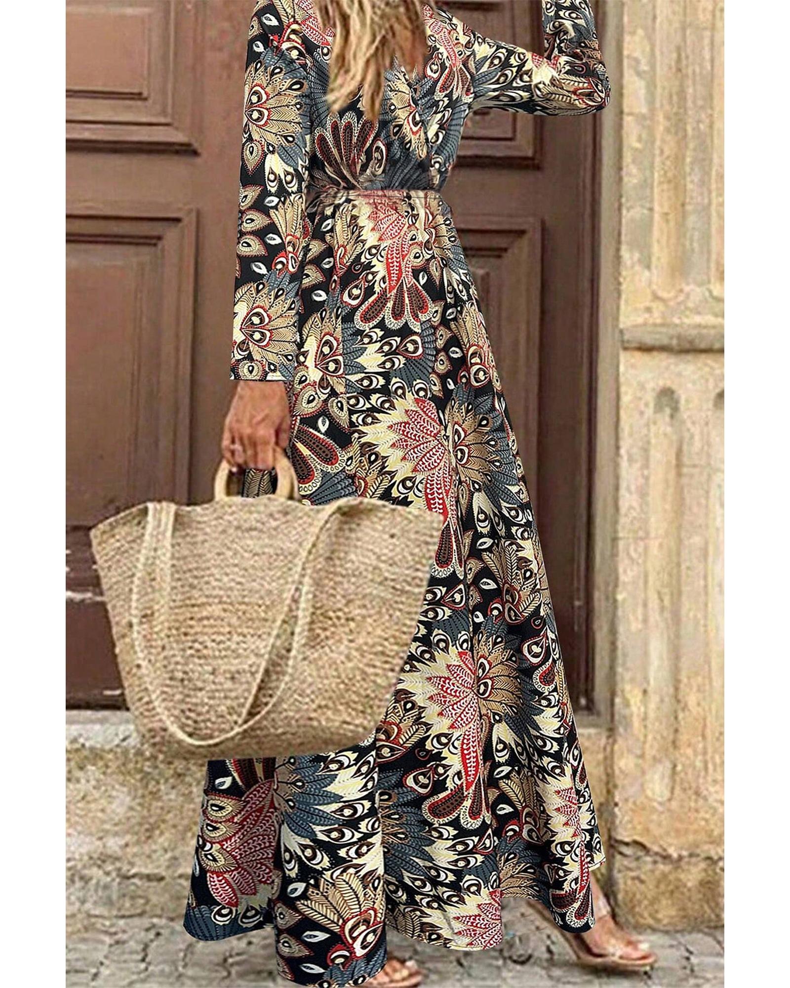 Black Floral Print V Neck Wrap High Waist Maxi Dress – M