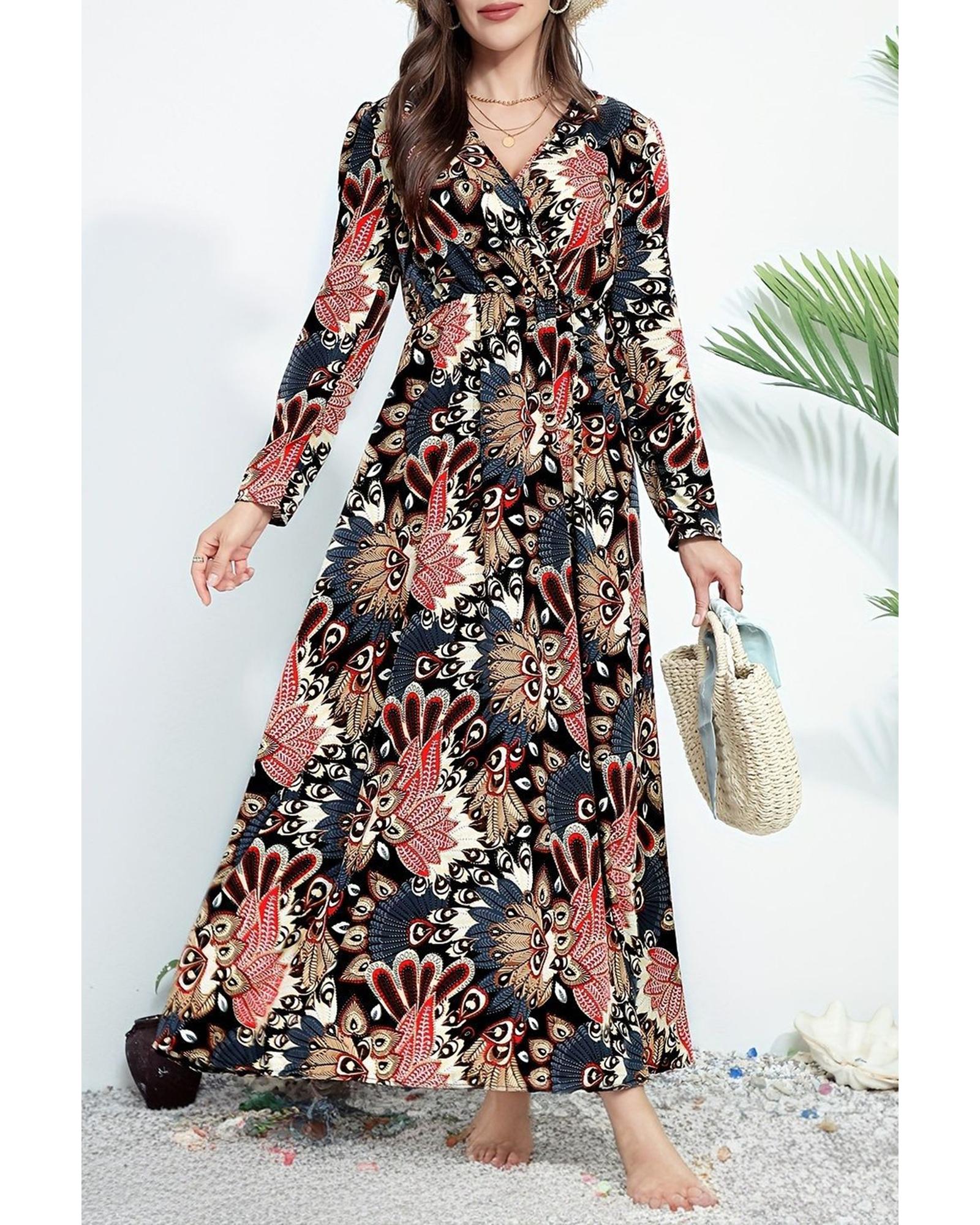 Black Floral Print V Neck Wrap High Waist Maxi Dress – S
