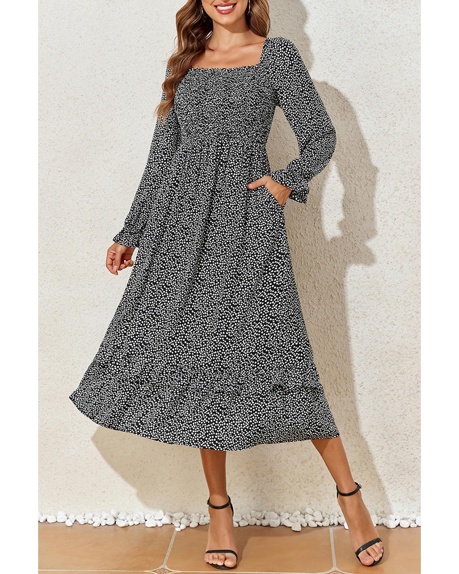 Black Floral Printed Long Sleeve Square Neck Midi Dress – XL
