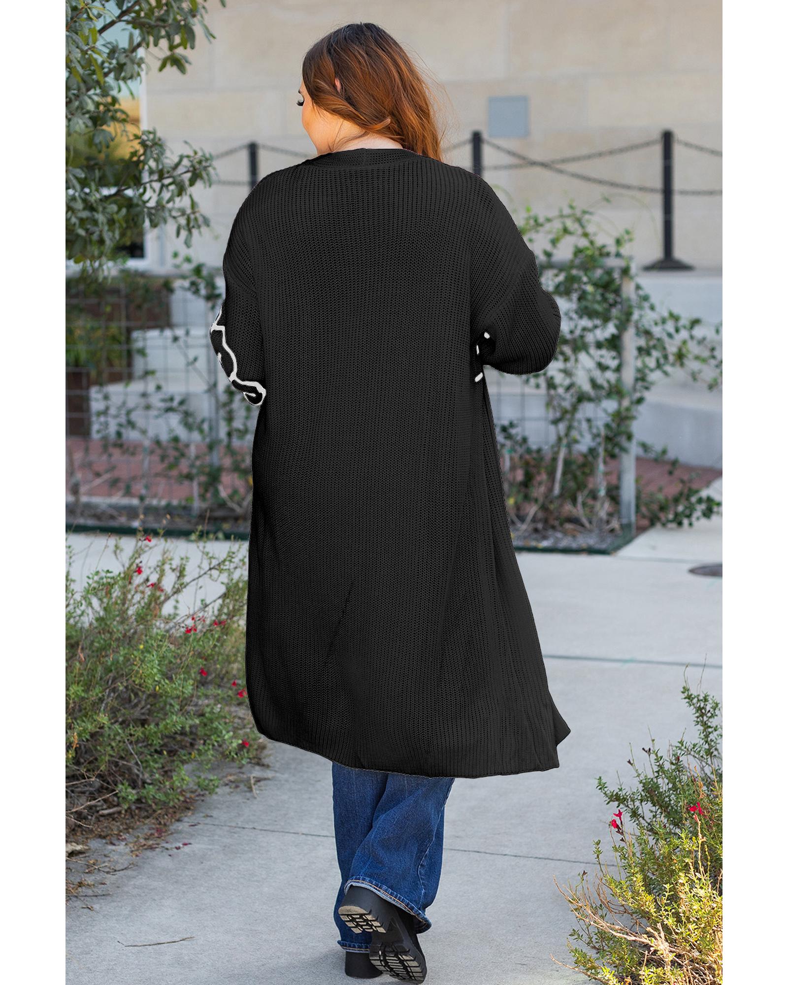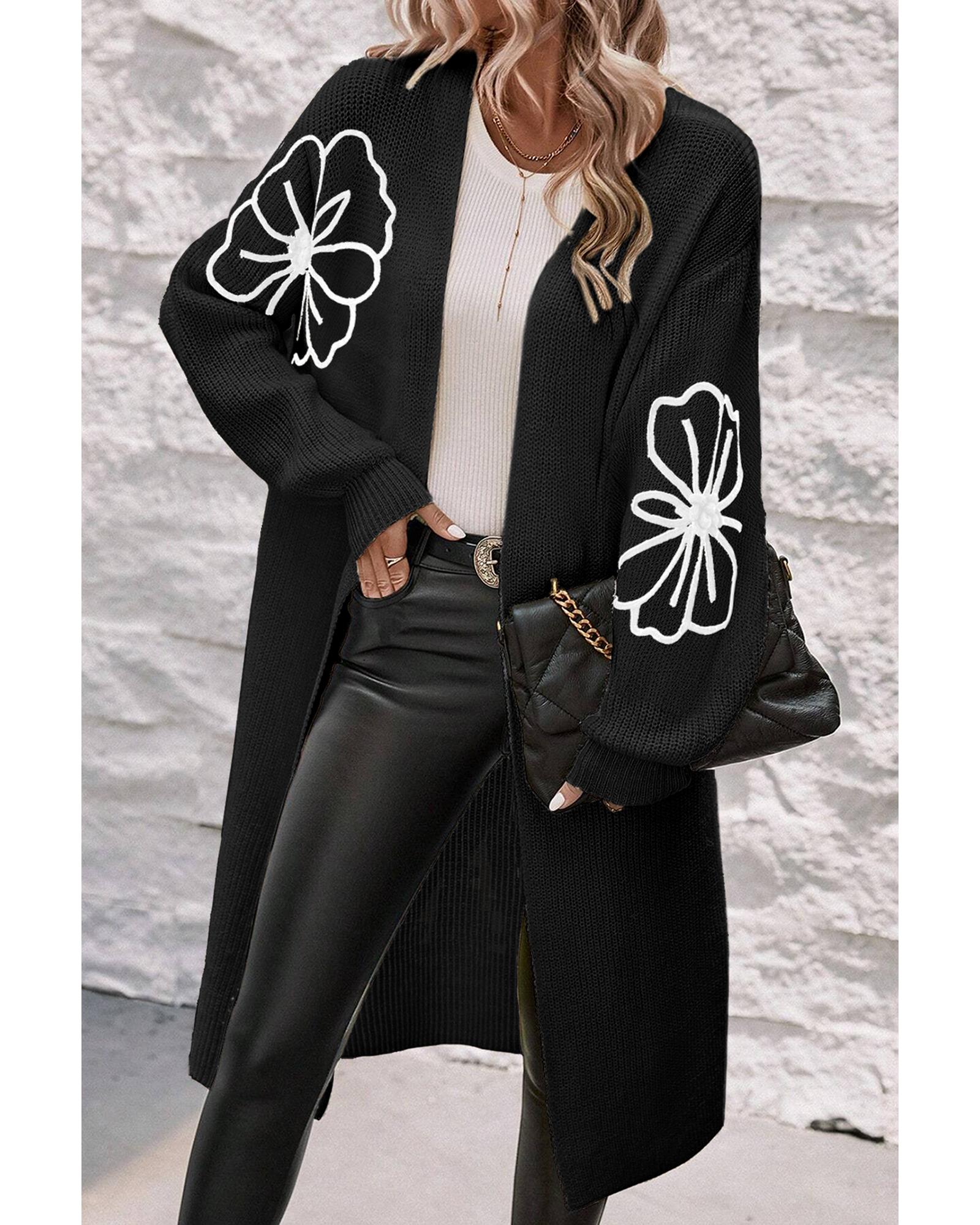 Black Flower Embroidered Drop Shoulder Open Front Duster Cardigan – S