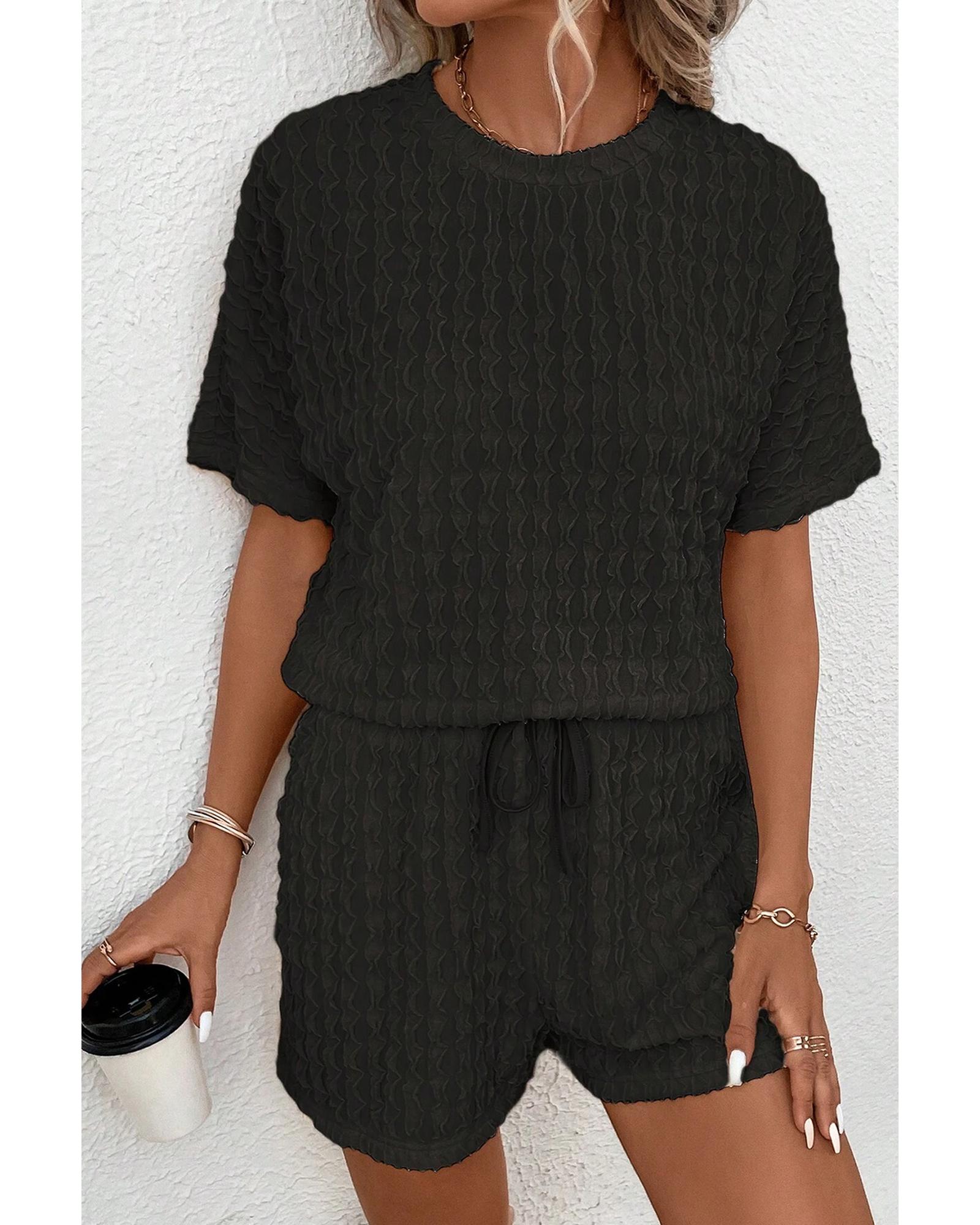 Black Frill Textured Short Sleeve Top and Drawstring Shorts Set – S