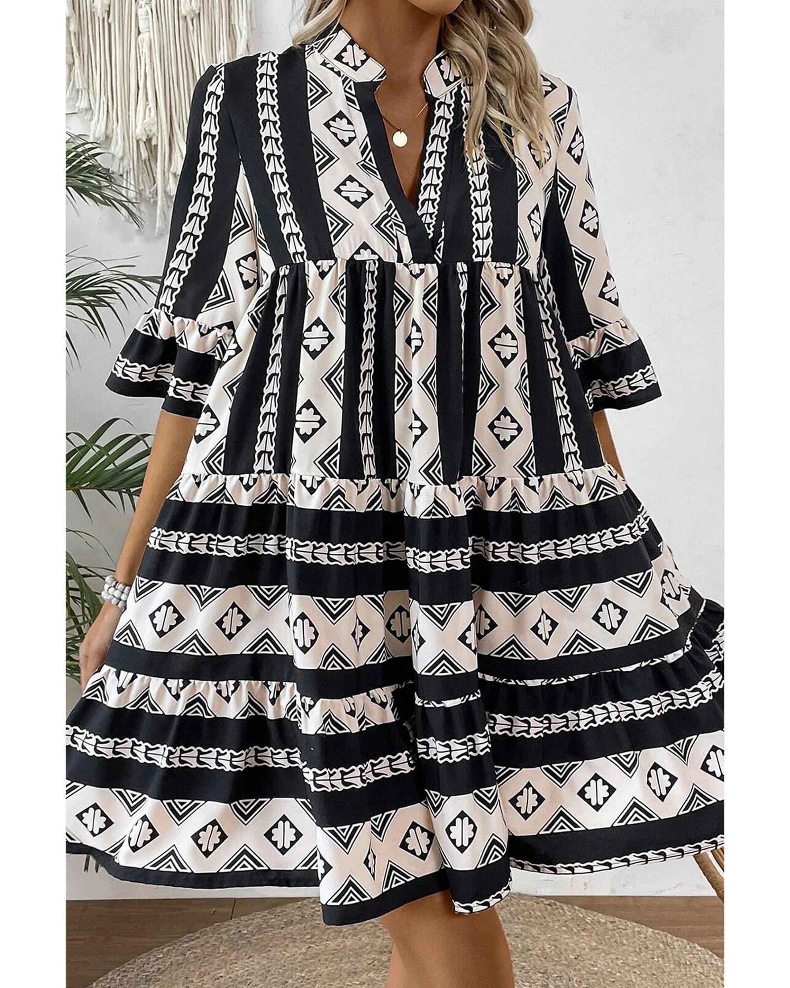Black Geometric Print V Neck Ruffled Dress – L