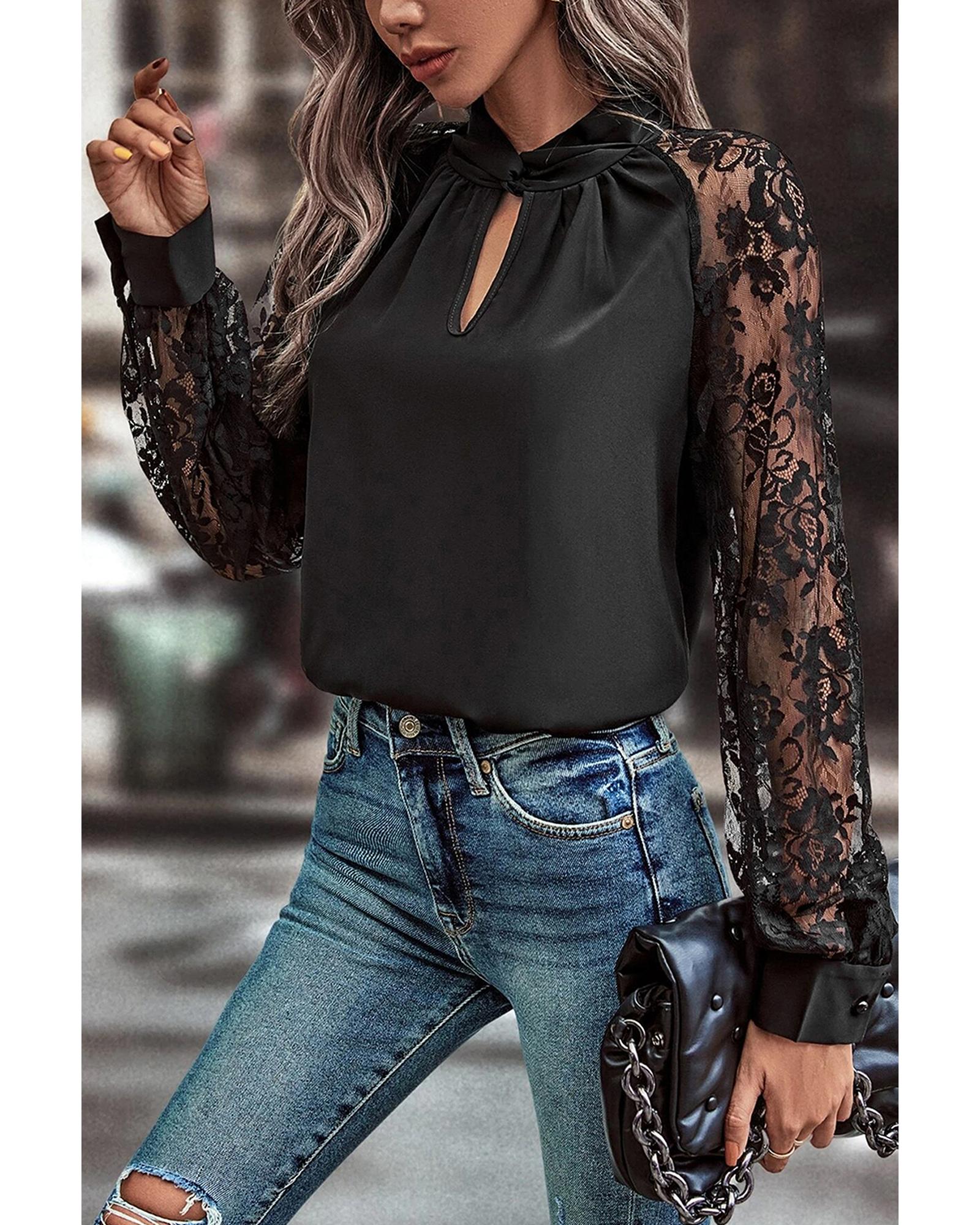 - Black Keyhole Neckline Floral Lace Raglan Sleeve Blouse