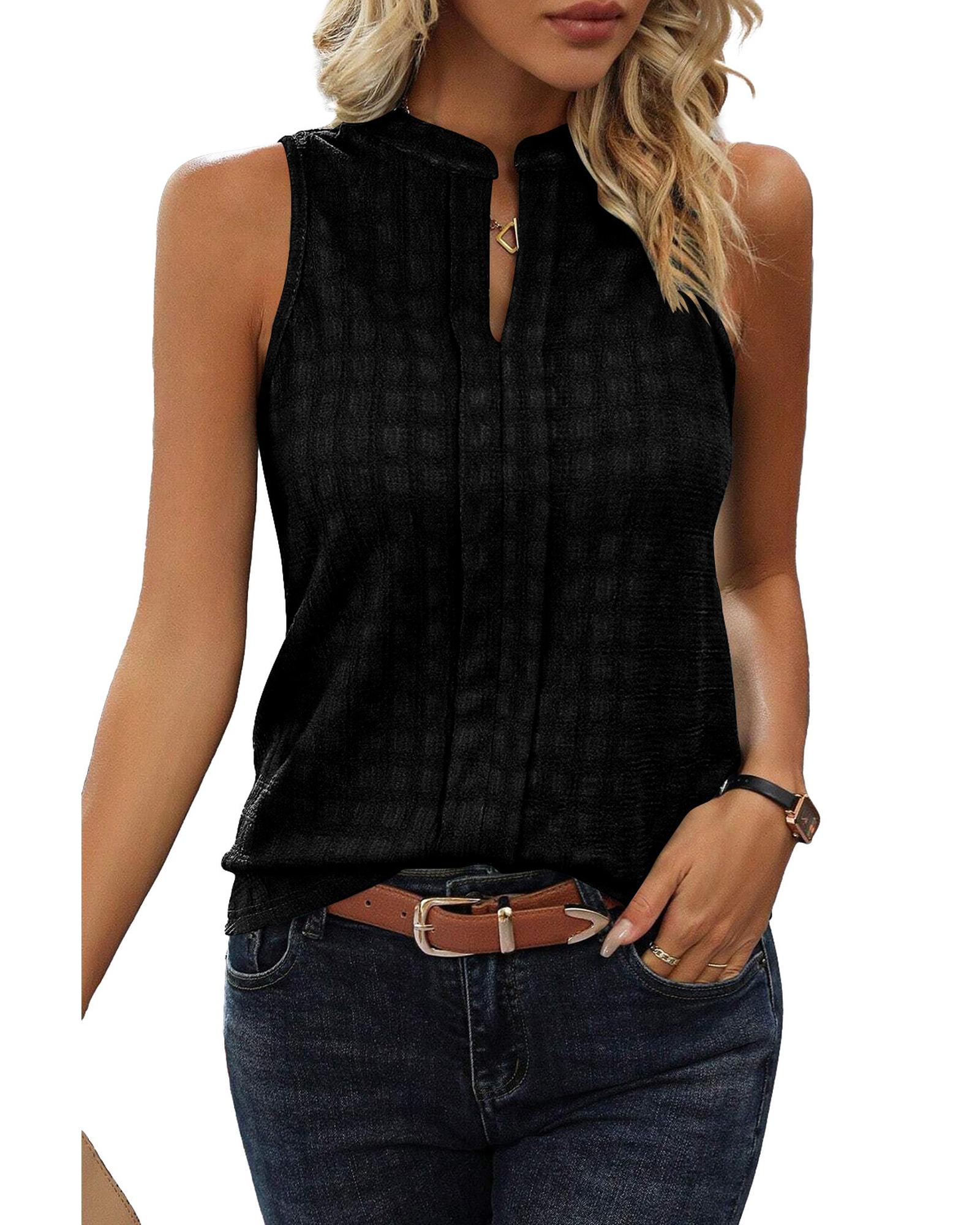 Black Lattice Textured Split Neck Tank Top – L