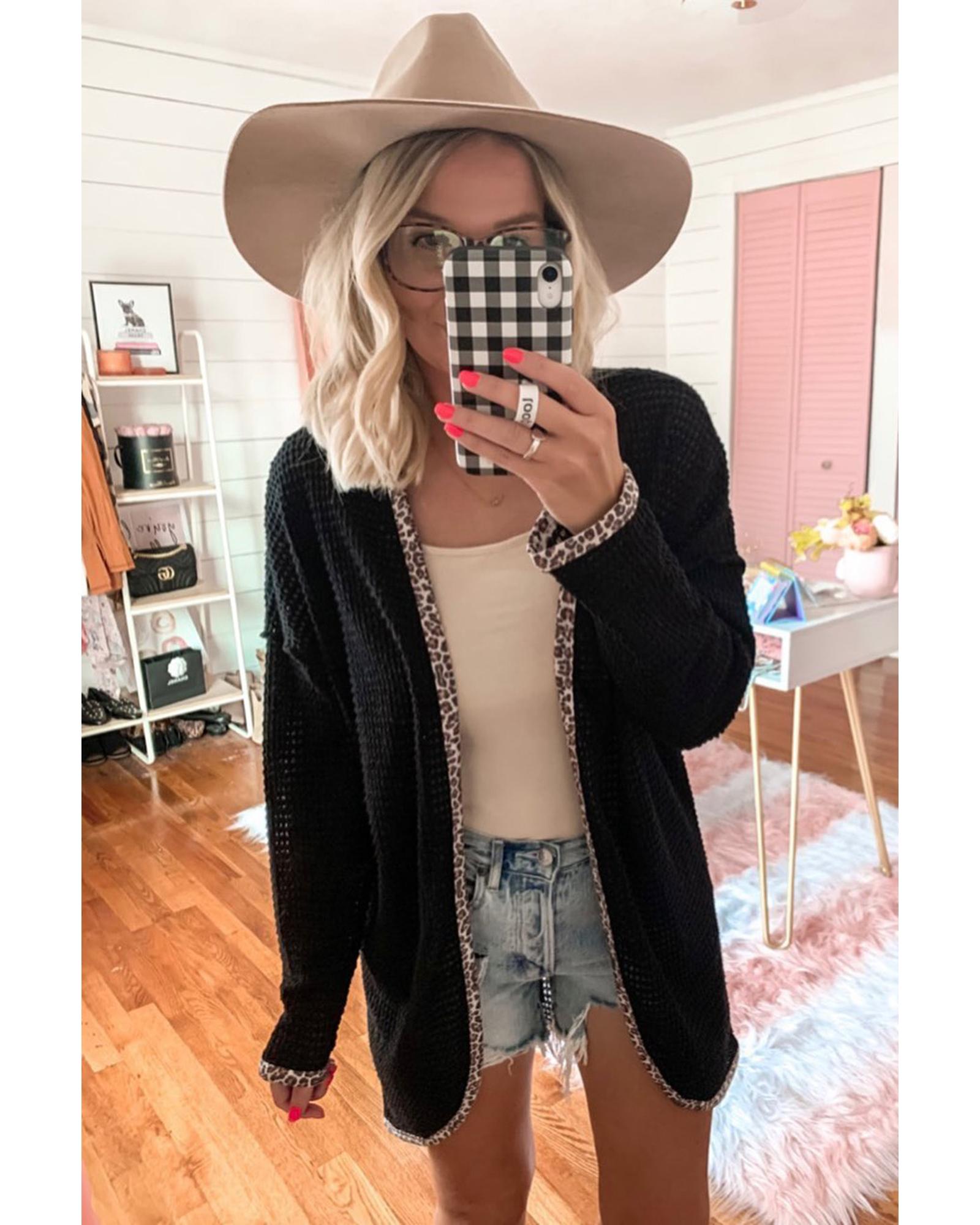 Black Leopard Contrast Waffle Knit Open Front Cardigan – M