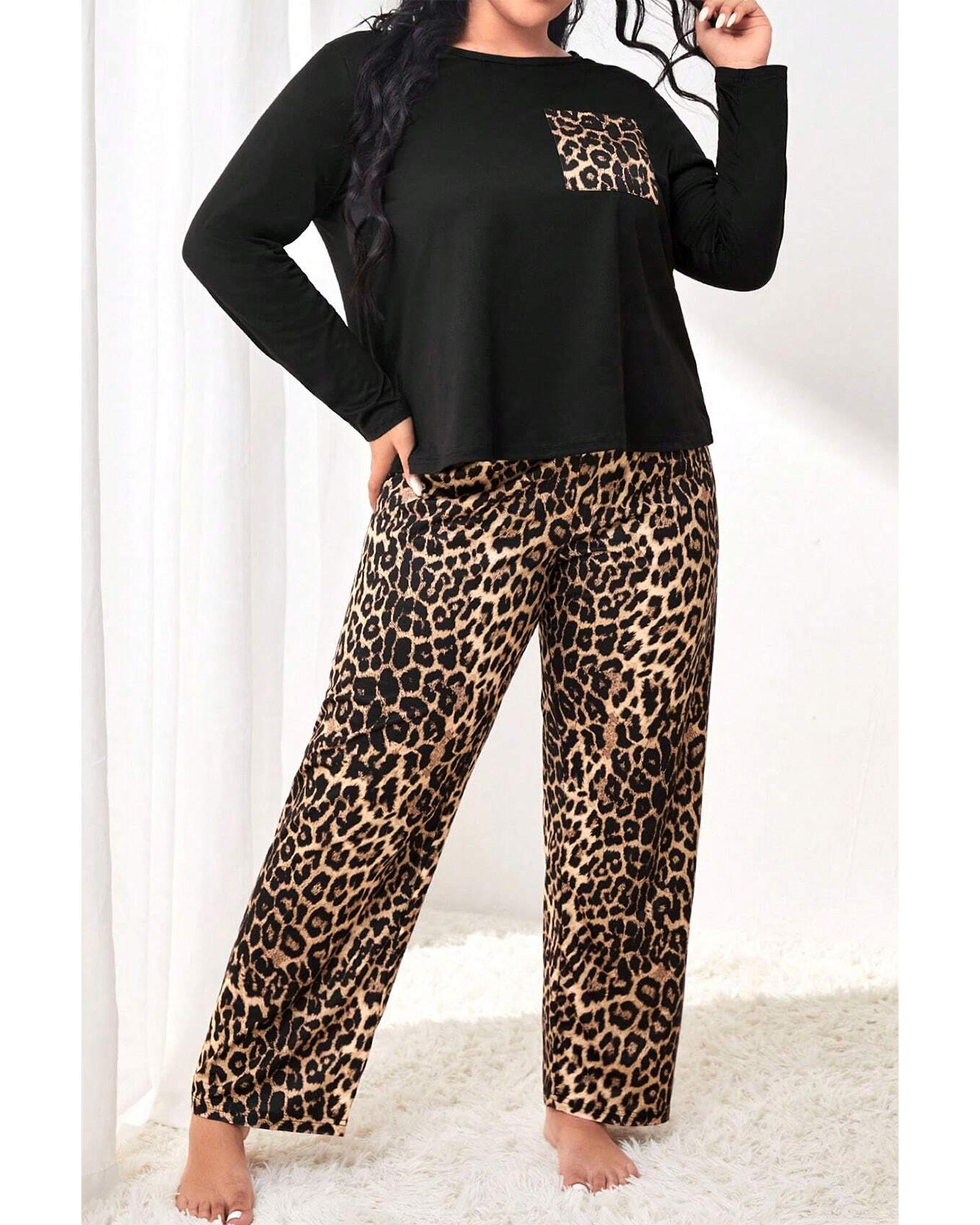 Black Leopard Patched Pocket Long Sleeve Top Plus Size Pants Set - 1X
