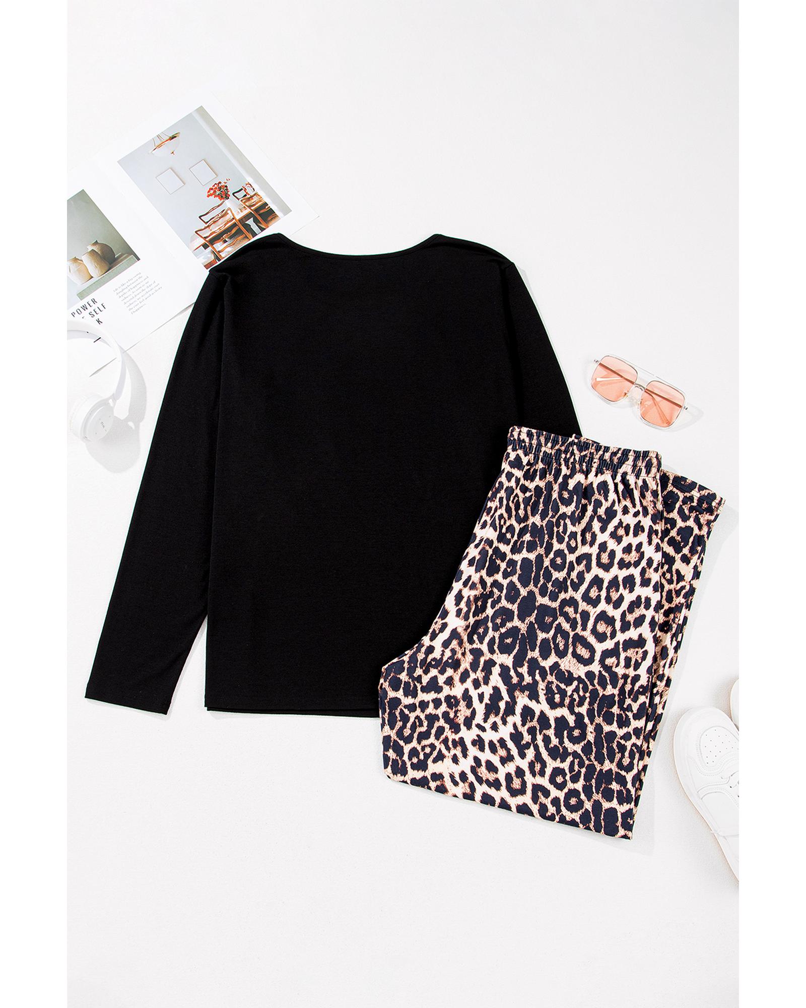 Black Leopard Patched Pocket Long Sleeve Top Plus Size Pants Set – 4X