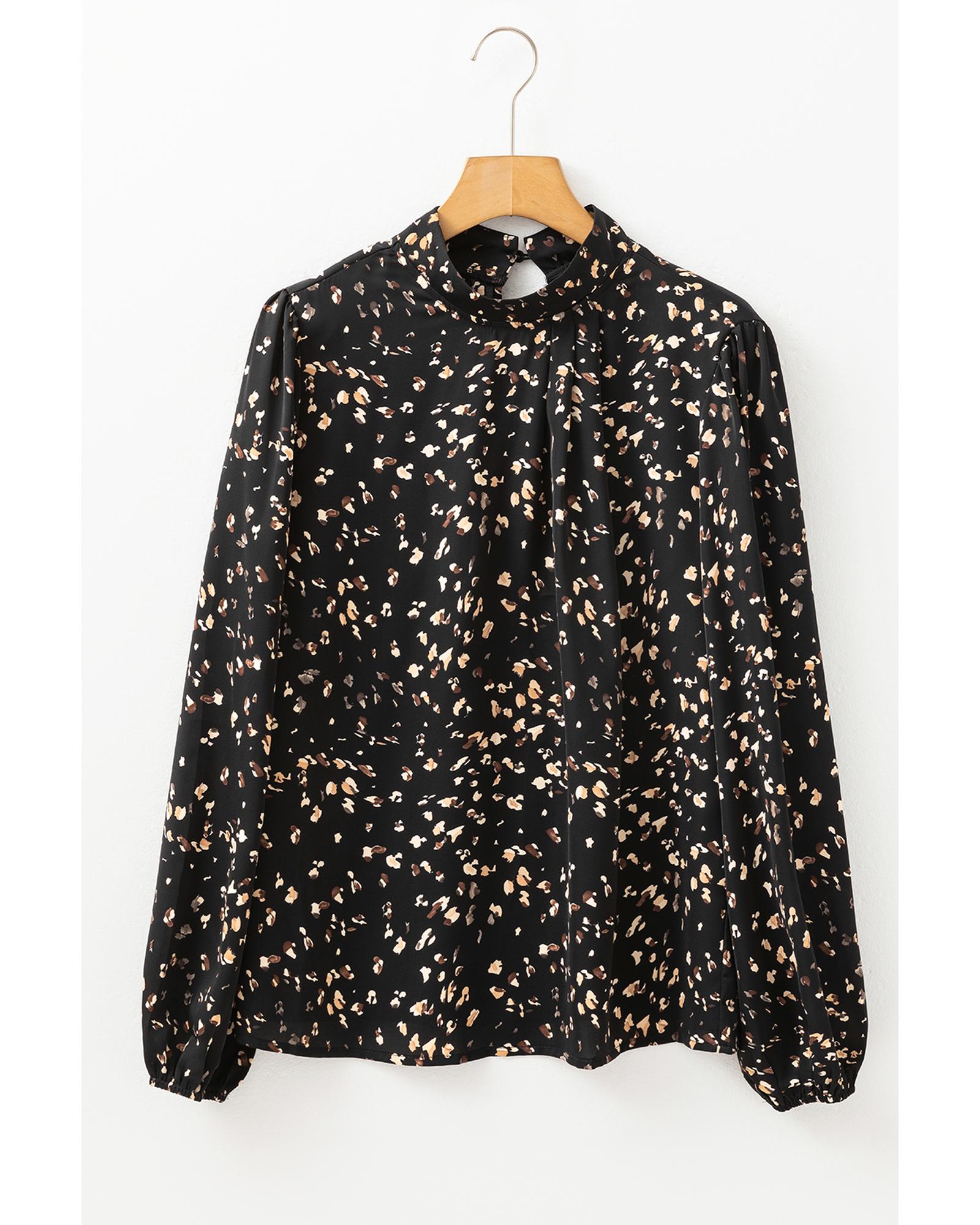 • Black Leopard Print Lantern Sleeve Mock Neck Pleated Blouse