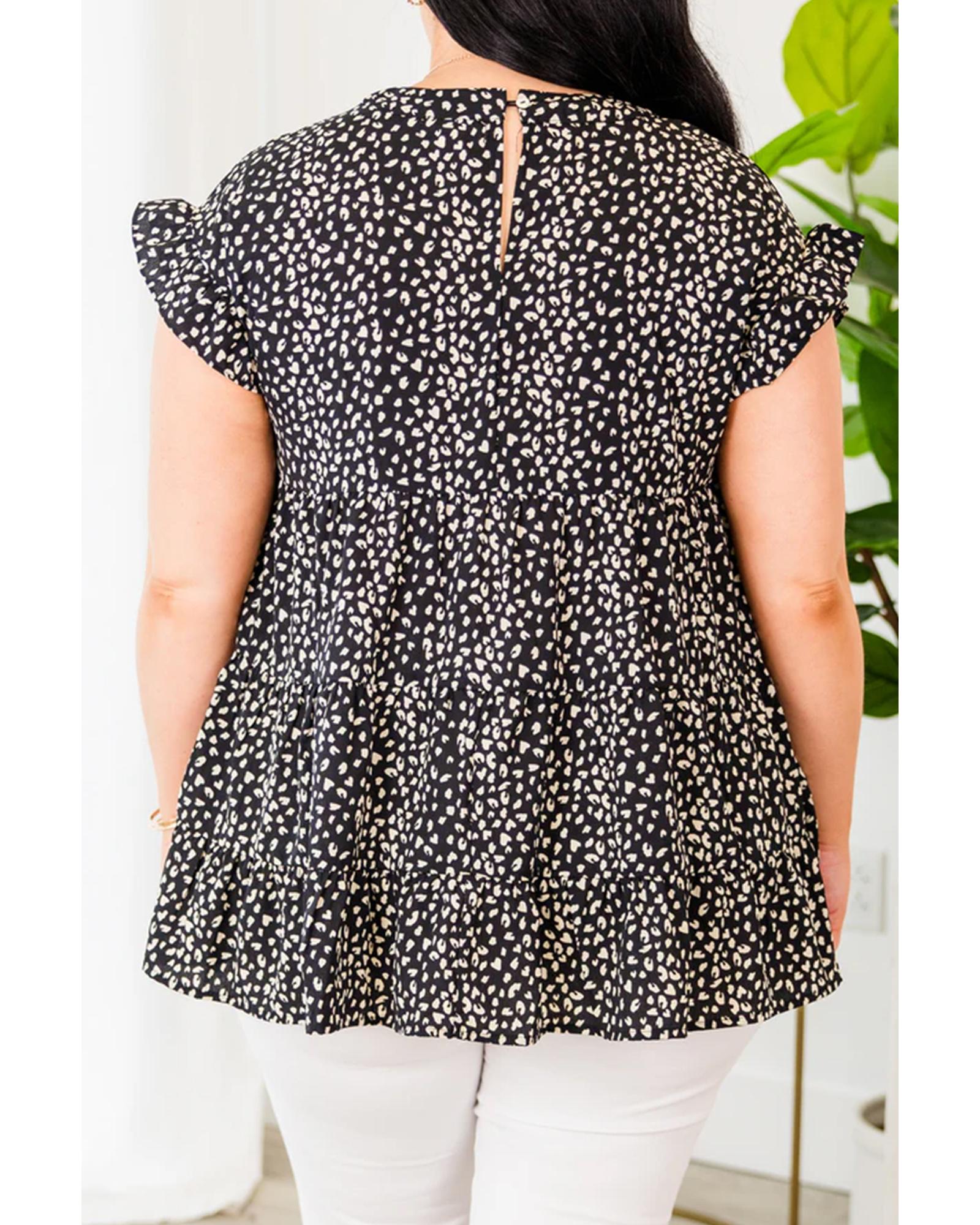 Black Leopard Print Ruffled Short Sleeve Keyhole Back Tiered Flowy Plus Size Blouse – 1X