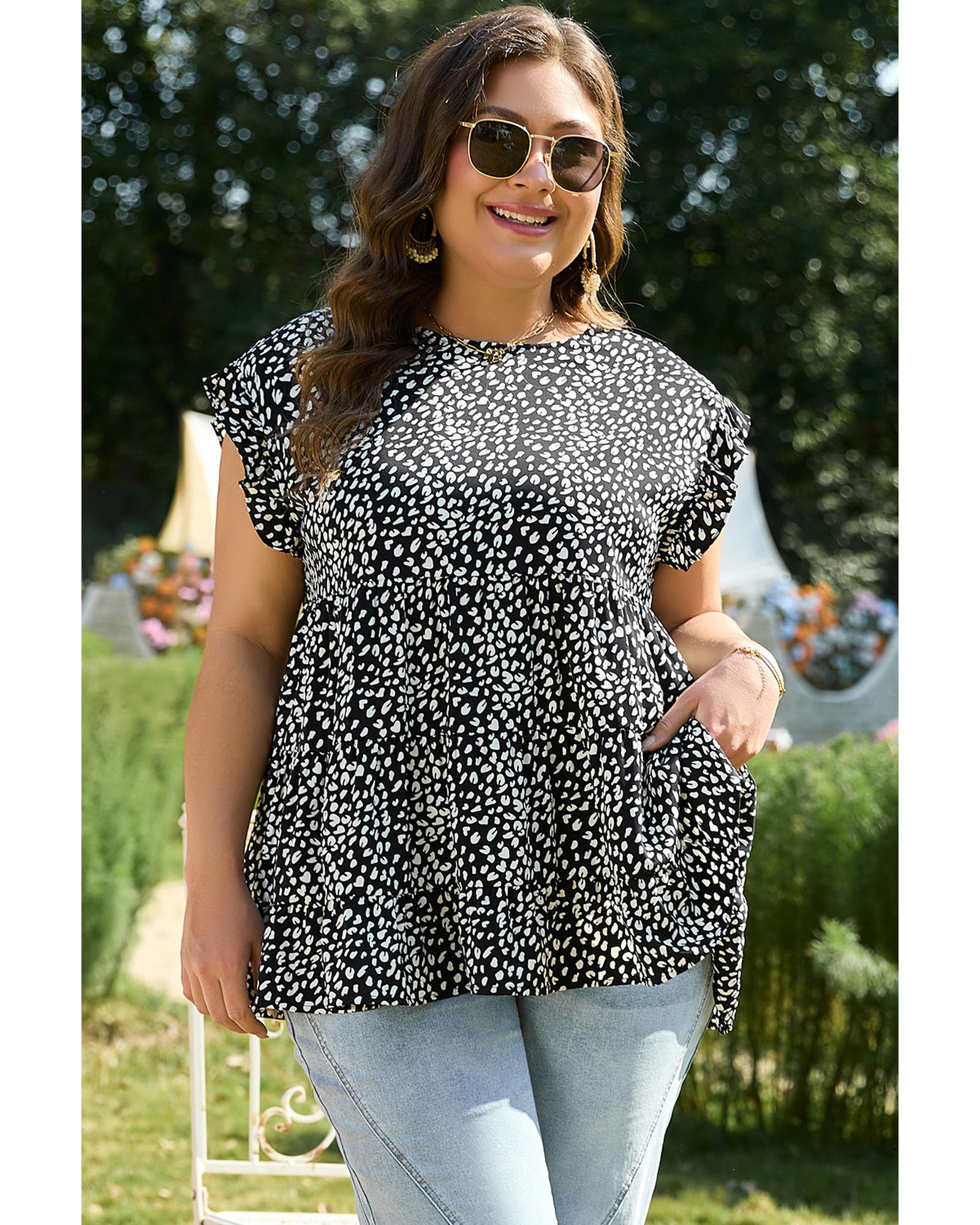 Black Leopard Print Ruffled Short Sleeve Keyhole Back Tiered Flowy Plus Size Blouse – 3X