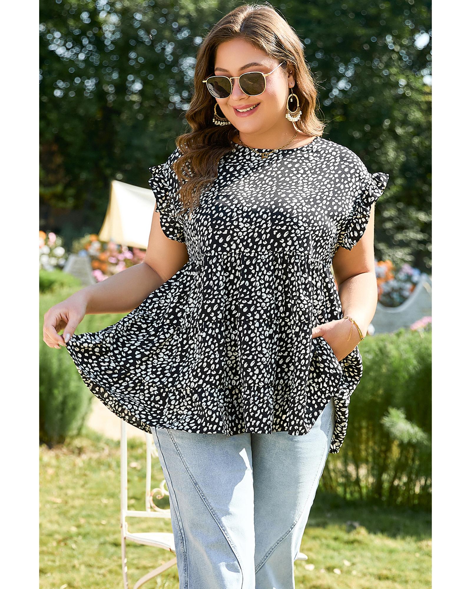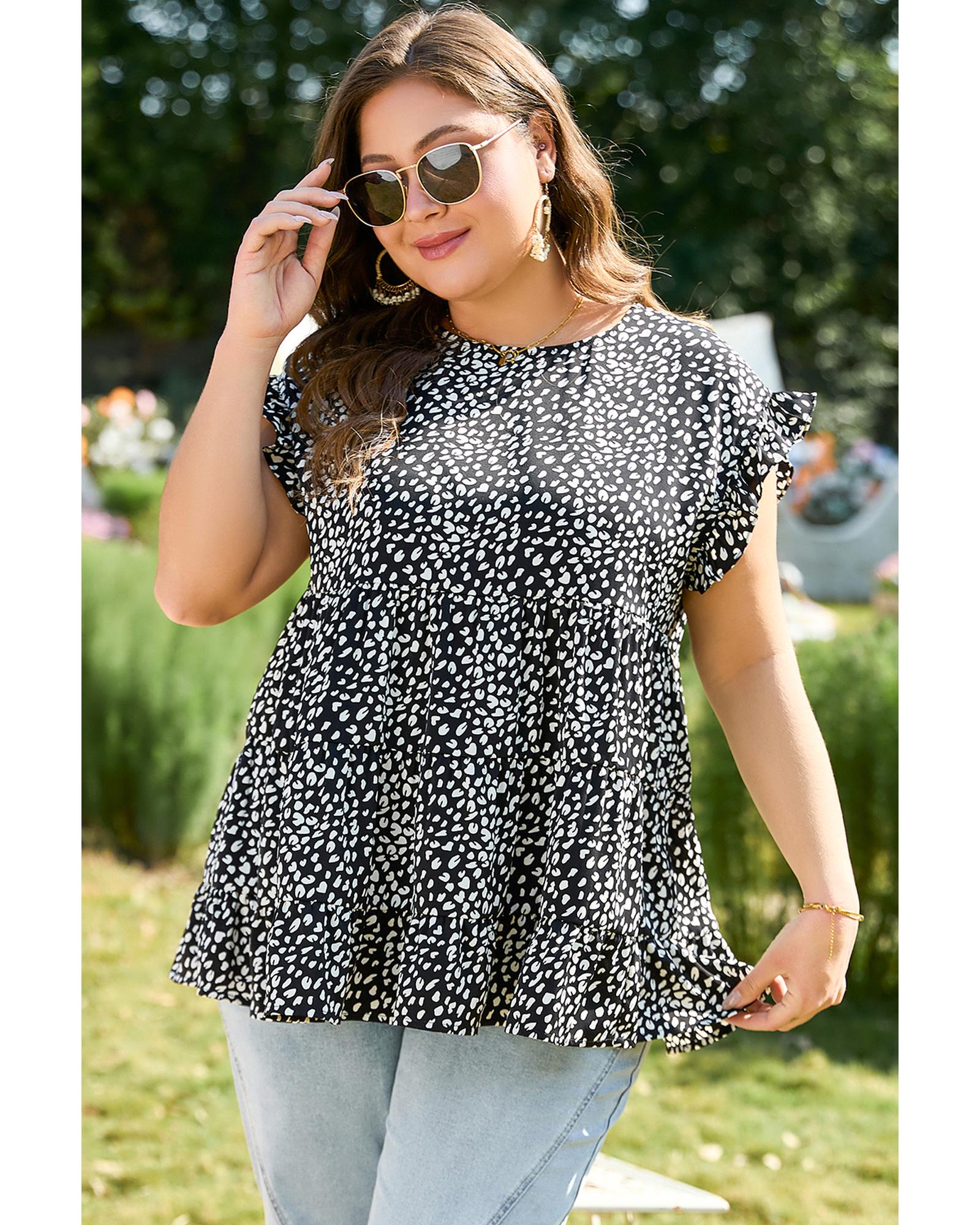 Black Leopard Print Ruffled Short Sleeve Keyhole Back Tiered Flowy Plus Size Blouse – 4X